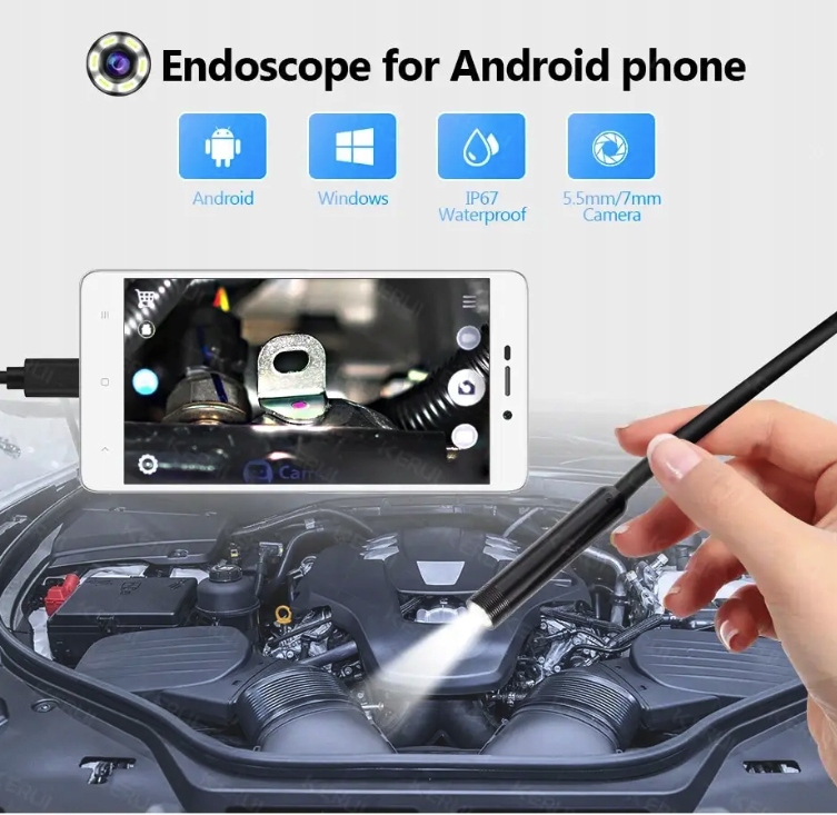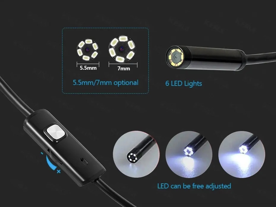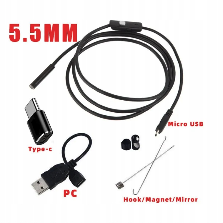 інспекційна камера з можливістю підключення до комп'ютерів та телефонів з невеликим діаметром 5,5 мм камери. Ендоскоп оснащений 6 світлодіодами з регульованою яскравістю, тому ви можете використовувати його навіть у темному середовищі. IP67 Водяна стійкість дозволяє контролювати ділянки під водою, проміжками, отворами та всіма твердими -дорічними місцями, такими як двигуни автомобілів тощо. Довжина 1 м.