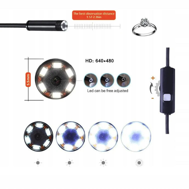 , оснащений об'єктивом камери 5,5 мм, цей ендоскоп забезпечує високоякісні зображення, забезпечуючи чіткі та детальні результати перевірки. Широка сумісність, що робить його практичним інструментом для різних користувачів.