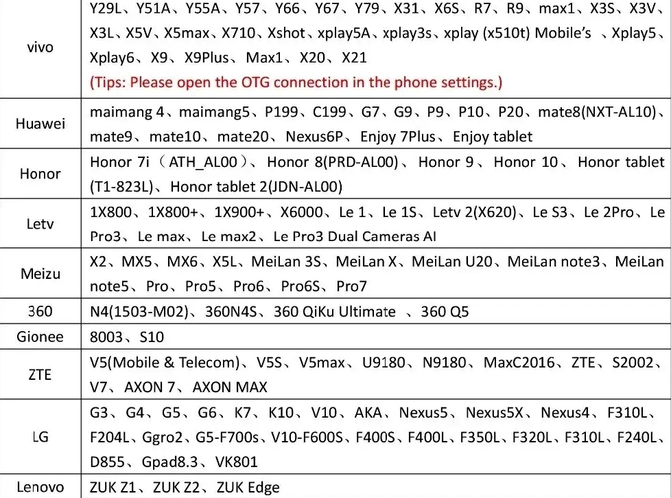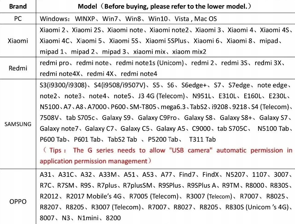 1. Переконайтеся, що ваш телефон підтримує функції OTG, а також сумісний з UVC (USB -класом відео -класу). Ця камера працює лише з деякими телефонами Android, що підтримують лише функцію OTG та зовнішні камери (обидва умови потрібні). Через відсутність зовнішніх камер всі мобільні телефони Samsung A/J та Samsung S7 не відповідають цій камері.