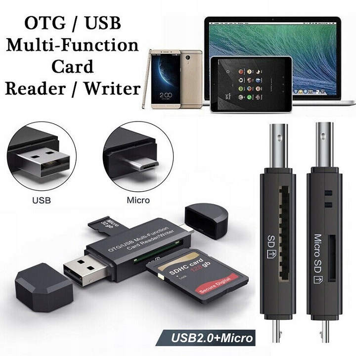 ПРИМІТКА: перед покупкою зробіть переконайтеся, що ваш пристрій має мікропорт USB і підтримує функцію USB OTG. Дозволяє використовувати як пристрій для зчитування карток USB 2.0 SD / microSD для прямого обміну даними між картками пам’яті та ПК, ноутбуками, ультрабуками, смартфонами та планшетами.