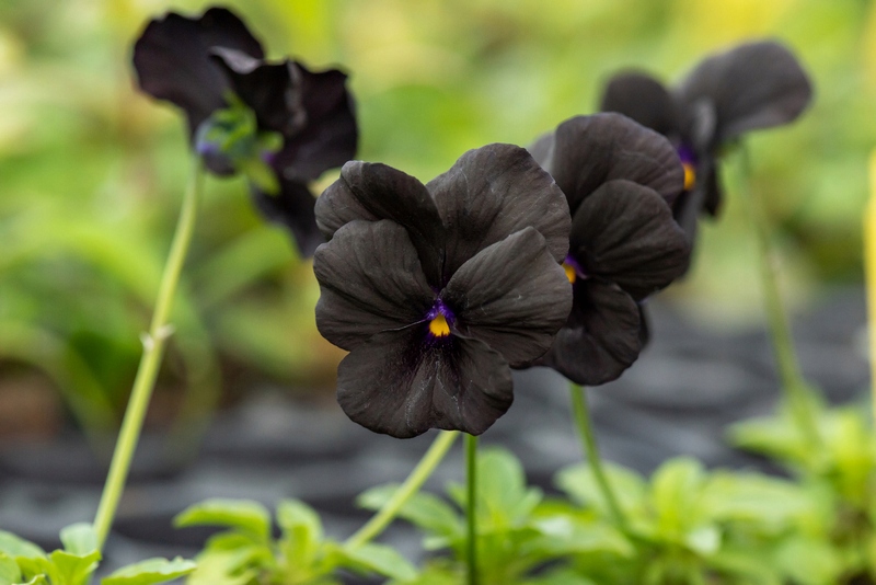 Квіти (травень - листопад) чорні з контрастними фіолетово-жовтими вічками.