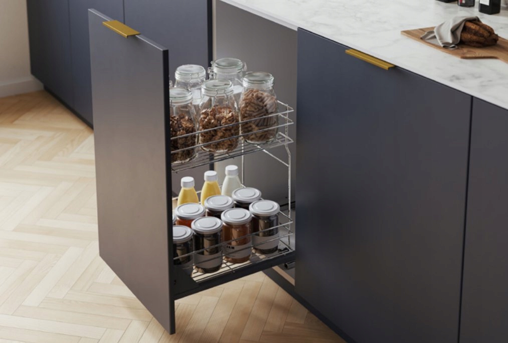 Нижні два вантажні вантажі розроблені для кухонних шаф не більше 250 мм. Вантаж оснащений повною круїзною системою. Самоповерхівка з гальмом гарантує спокійне закриття, а повне ковзання дозволяє легко отримати доступ до вмісту шафи. Вантаж виготовлений з дроту та оцинкованого, завдяки якому він створює враження хрому, путівники сріблясті.