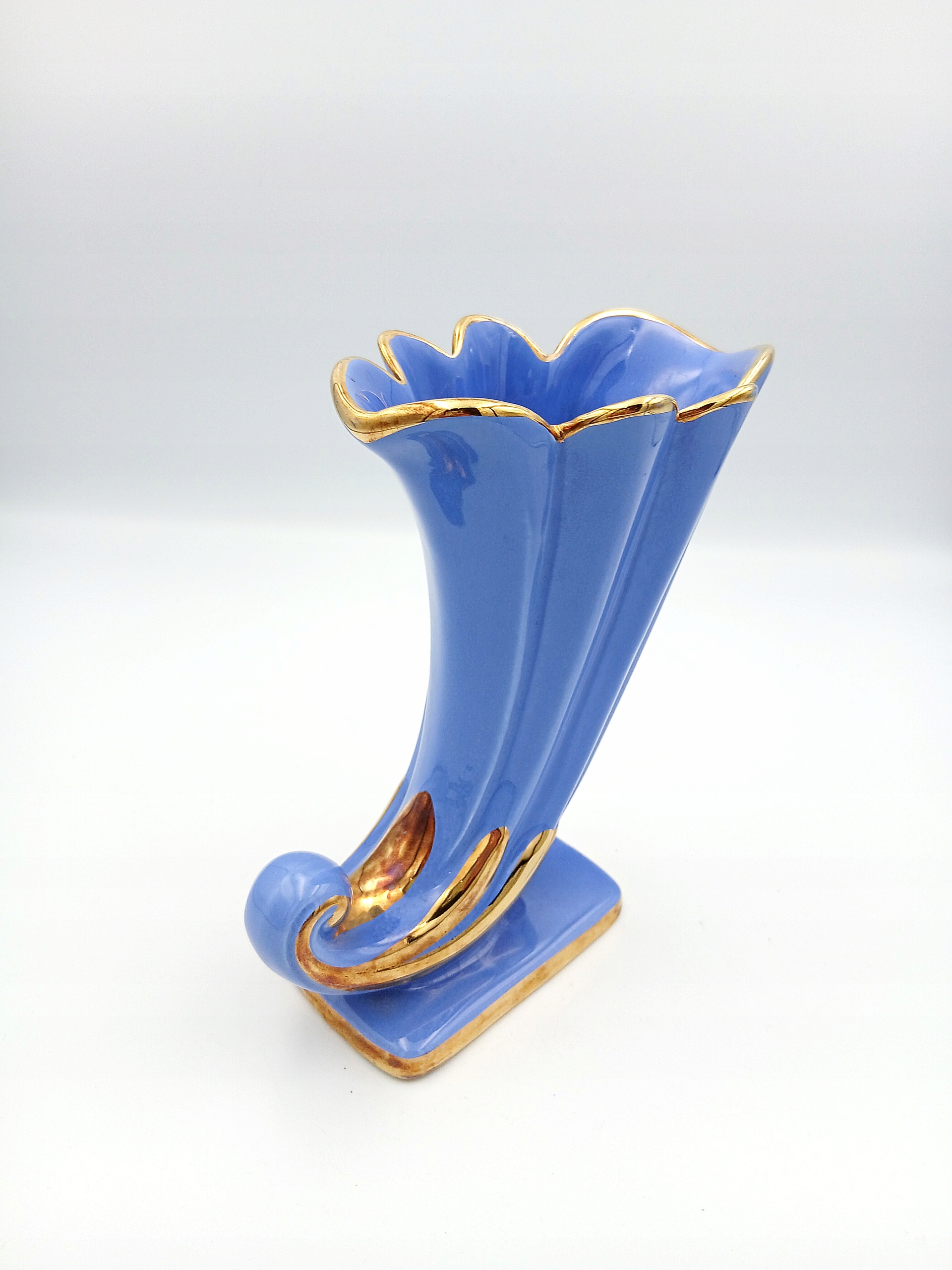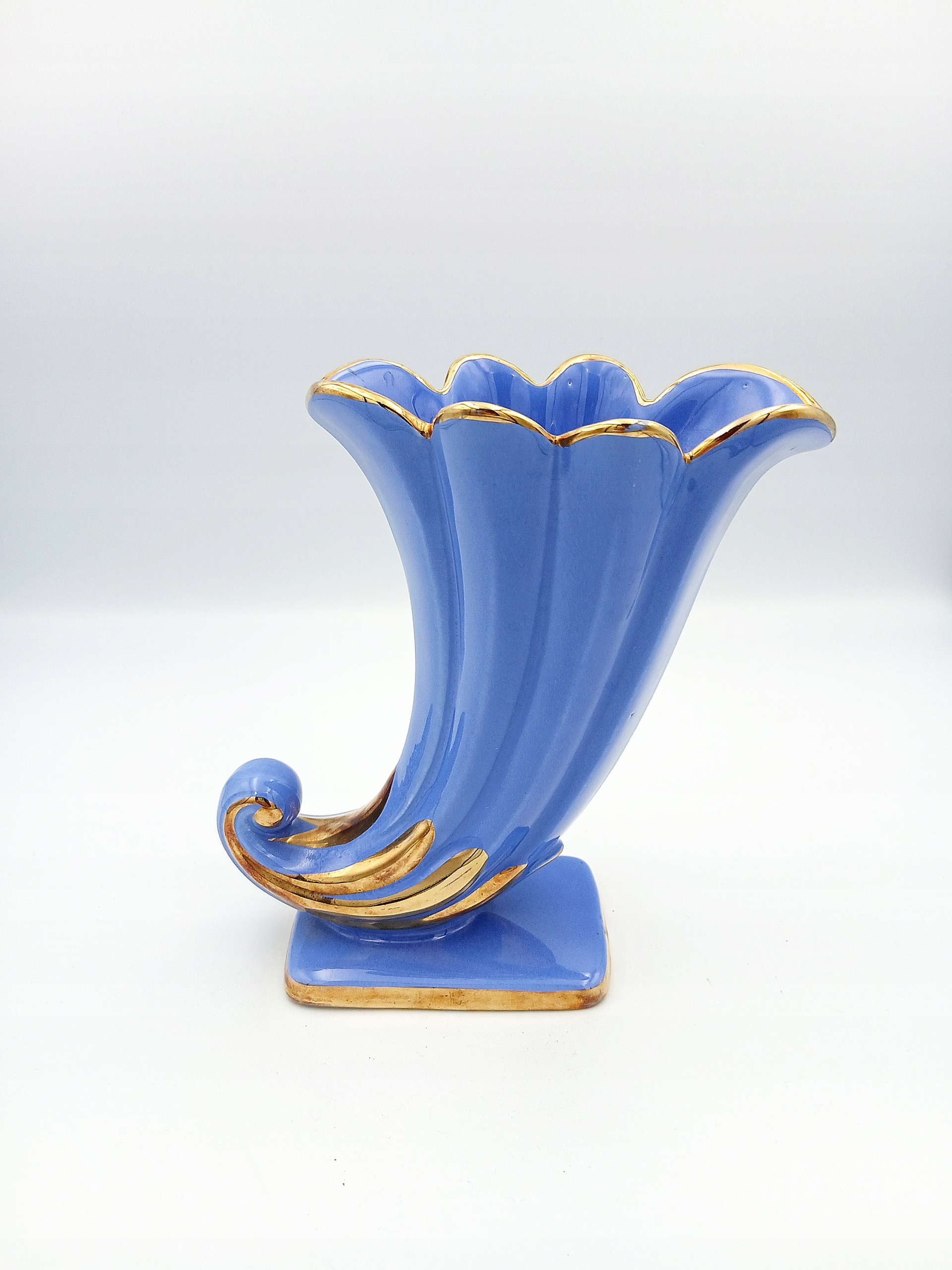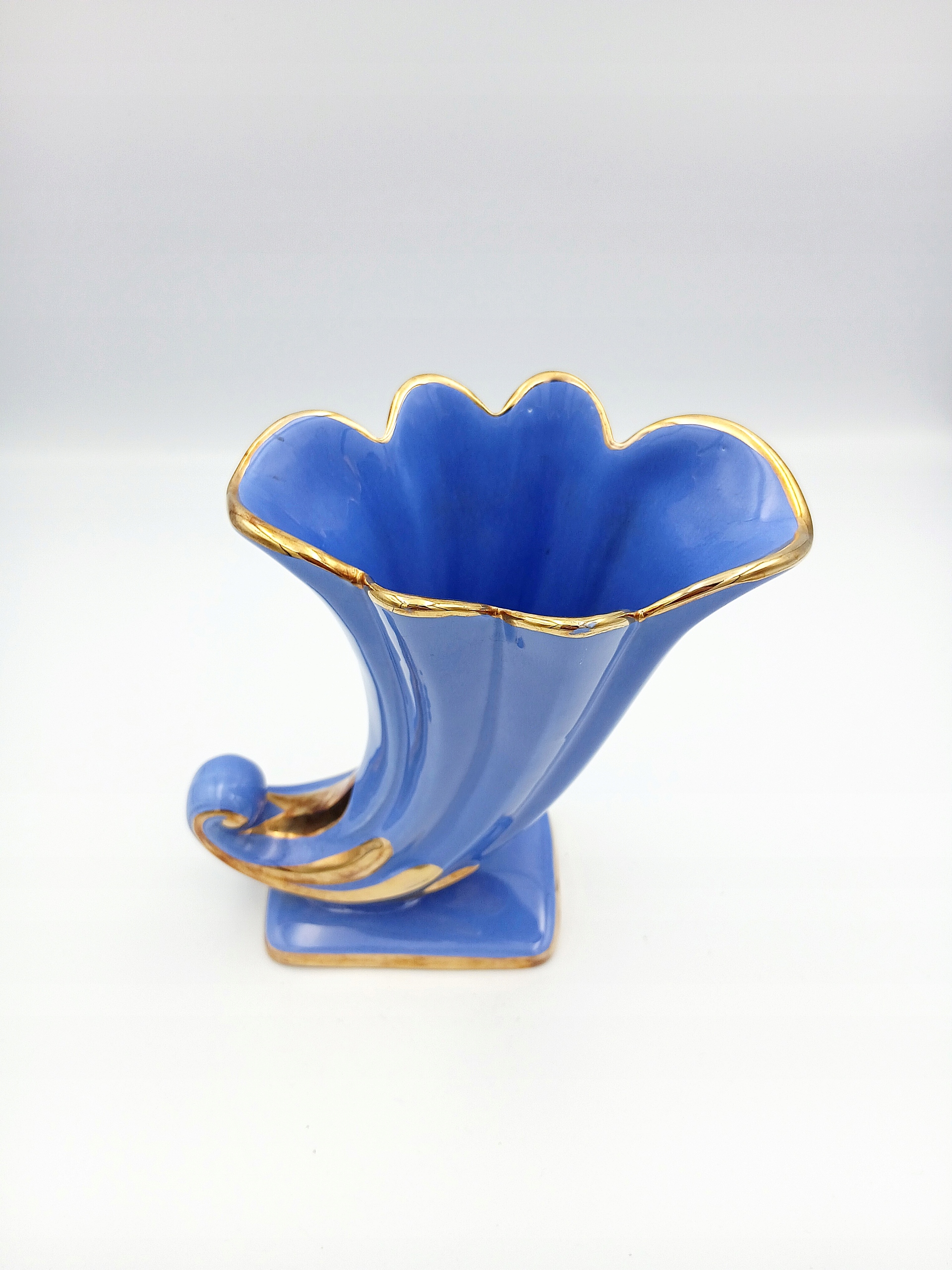 ☑ Елегантна порцелянова ваза у вигляді куточка достатку, виробленої престижним шведським виробництвом Gefle Porslin . Продукт характеризується експресивною кобалітною емалі та багатим ручним позолотом , які підкреслюють лінії та деталі форми.