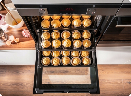 Нова конструкція інтер’єру в духовці з більшим обігрівачем кар'єри гарантує ідеальний, навіть розподіл тепла у всій камері. Завдяки цьому ви можете підготувати велику частину випічки, будьте впевнені, що вони будуть рівномірно запечені та підрум’янені. Ви можете легко вмістити понад 100 кексів у цій ємності! Ви також можете сушити гриби та фрукти на кількох рівнях. І більша поверхня задньої кришки вентилятора з новою системою відкриття прискорить нагрівання, щоб робота пройшла ще більш ефективно.