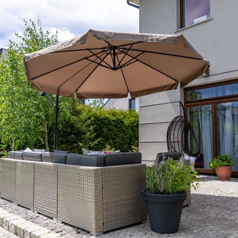 Коричнева парасолька від сонця дозволить вам створити затінене місце, щоб відпочити, пообідати або зустрітися з близькими.