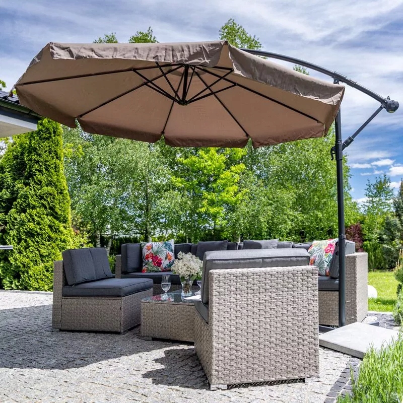 Накриття садової парасольки розміщено збоку від конструкції, що дозволяє 100% використовувати затінений простір.