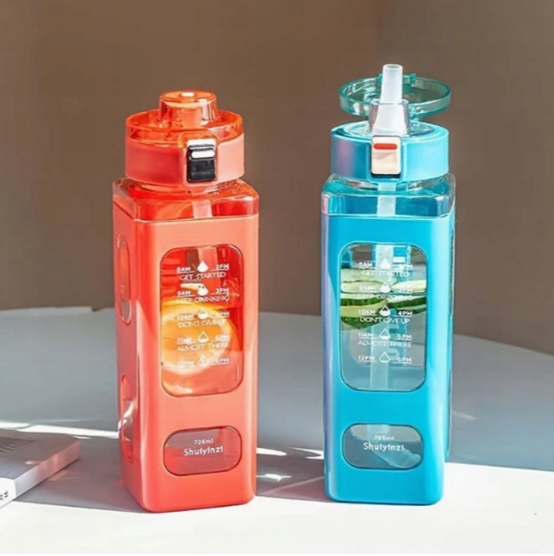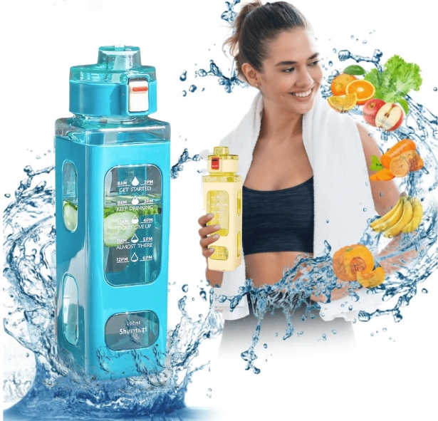 - На пляшці є мірна чашка, яка вказує на кількість випитої води.