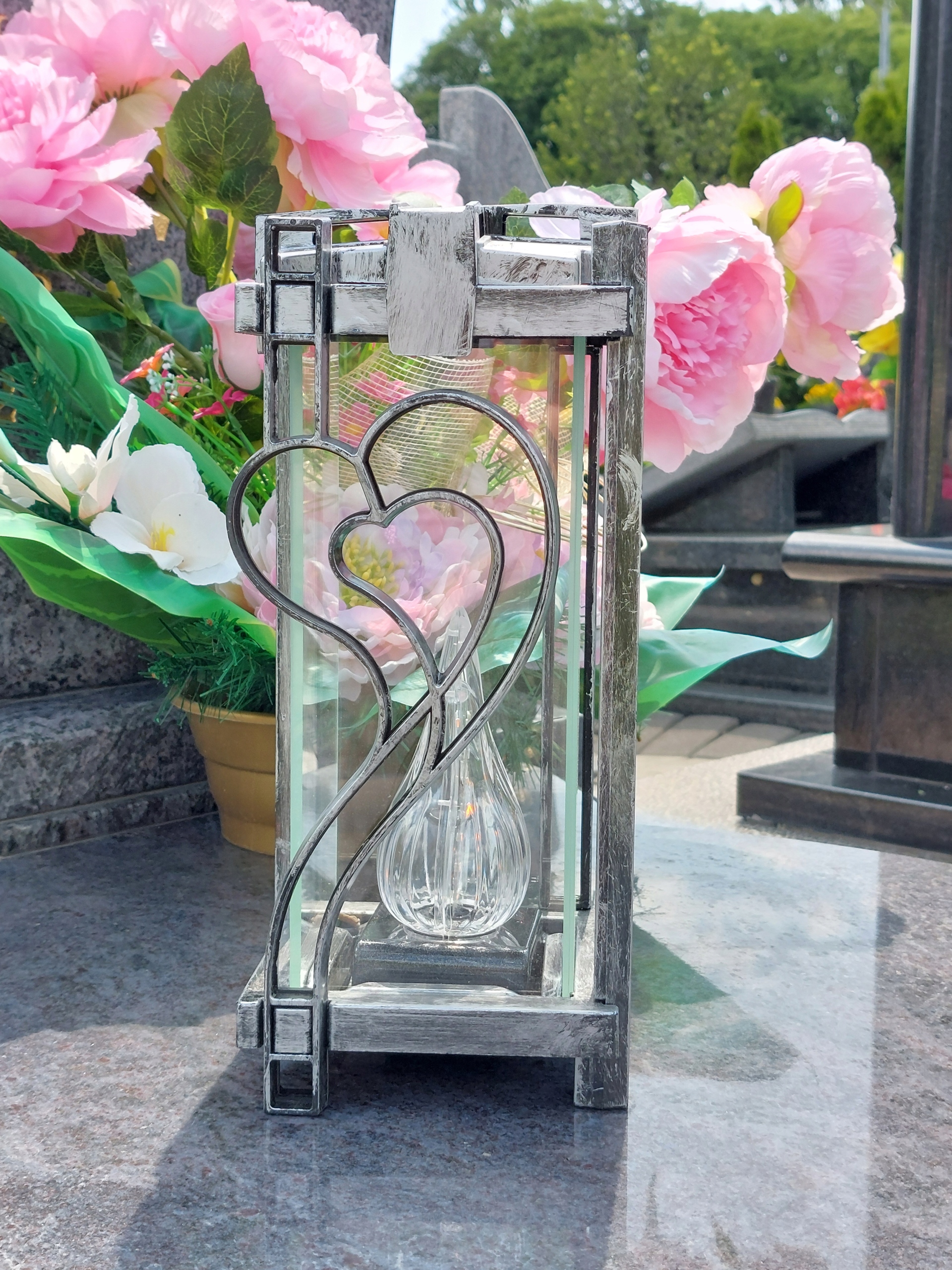 Велика сучасна скляна свічка з нанесенням срібного серця високо для могили 30 см