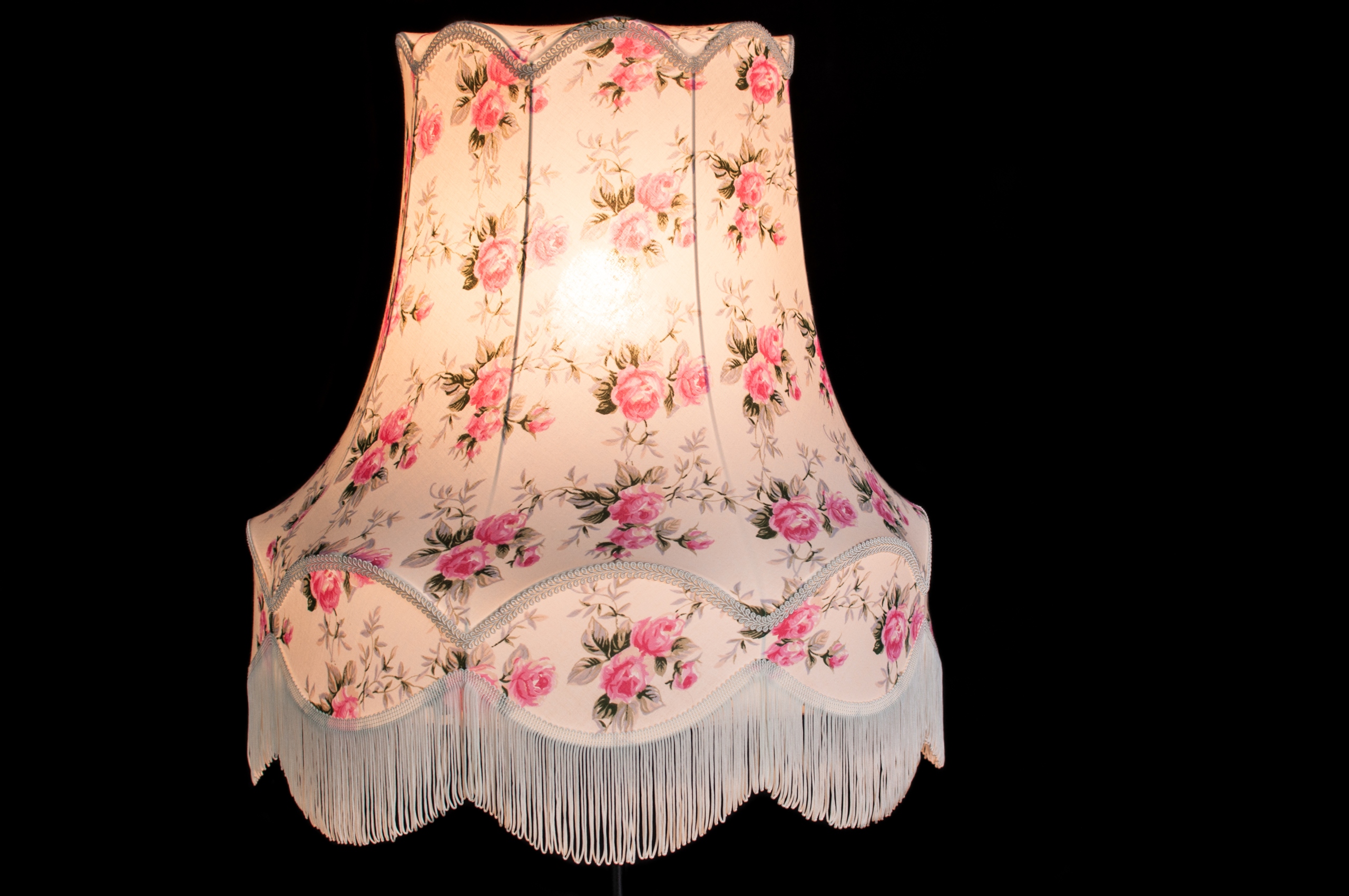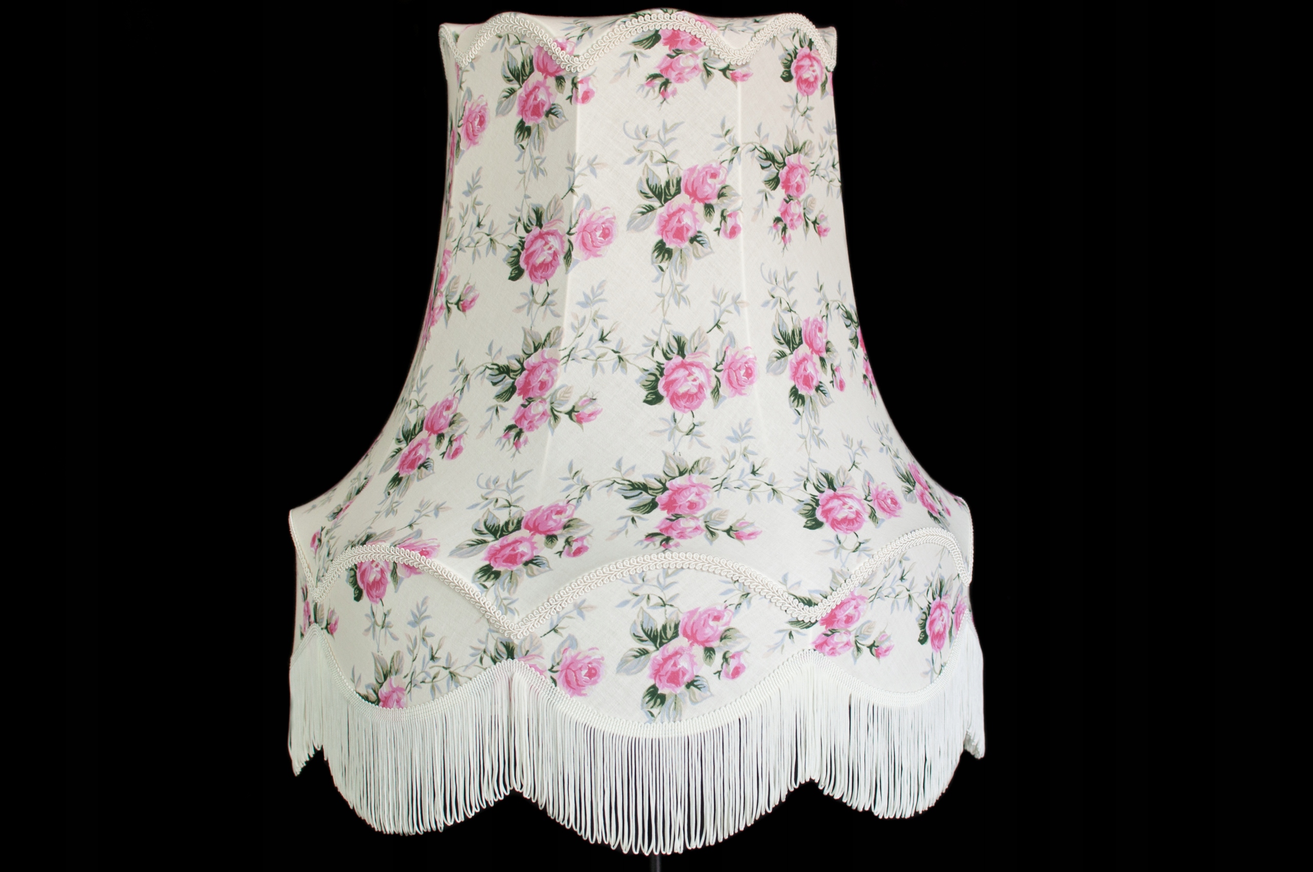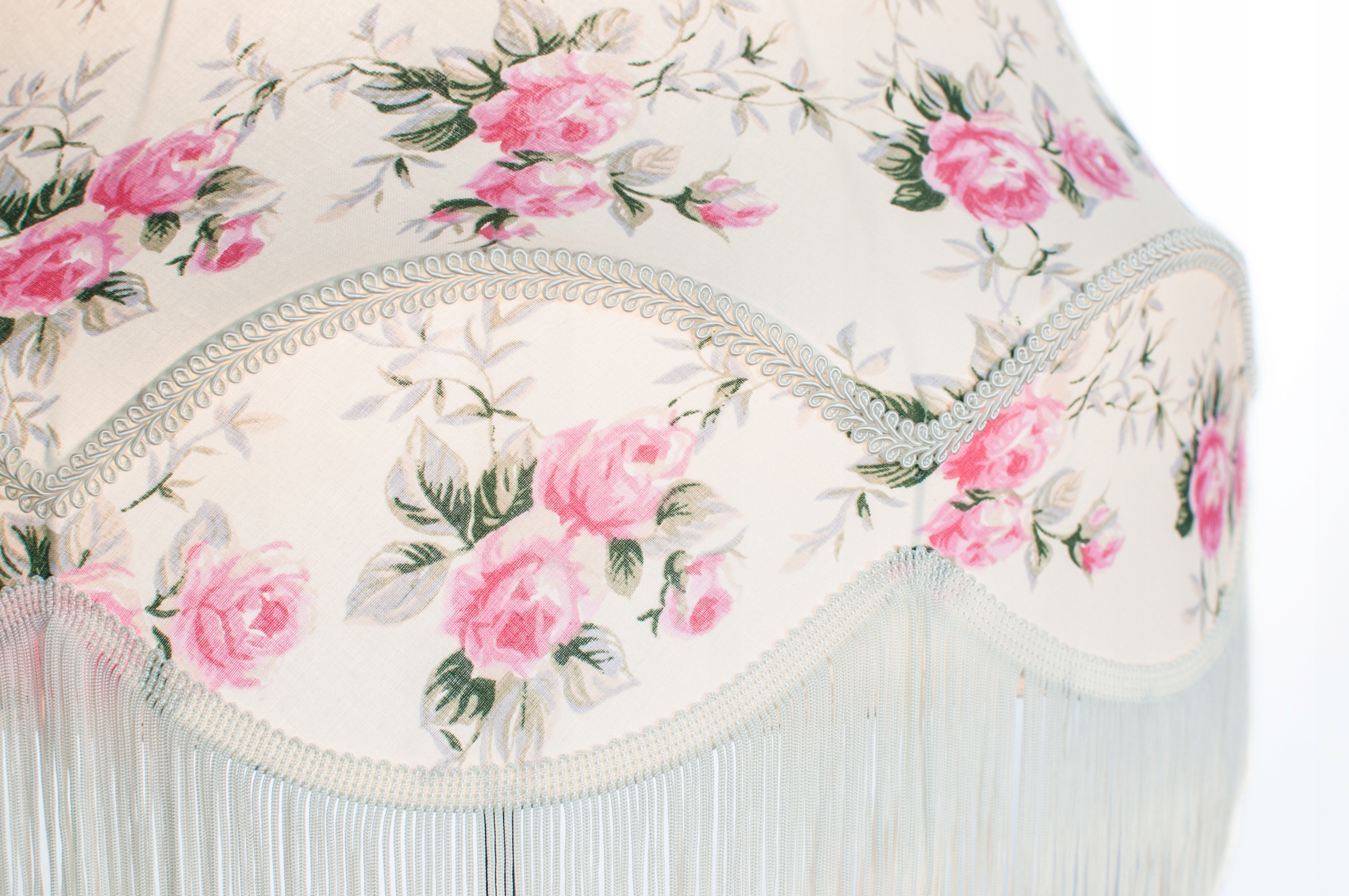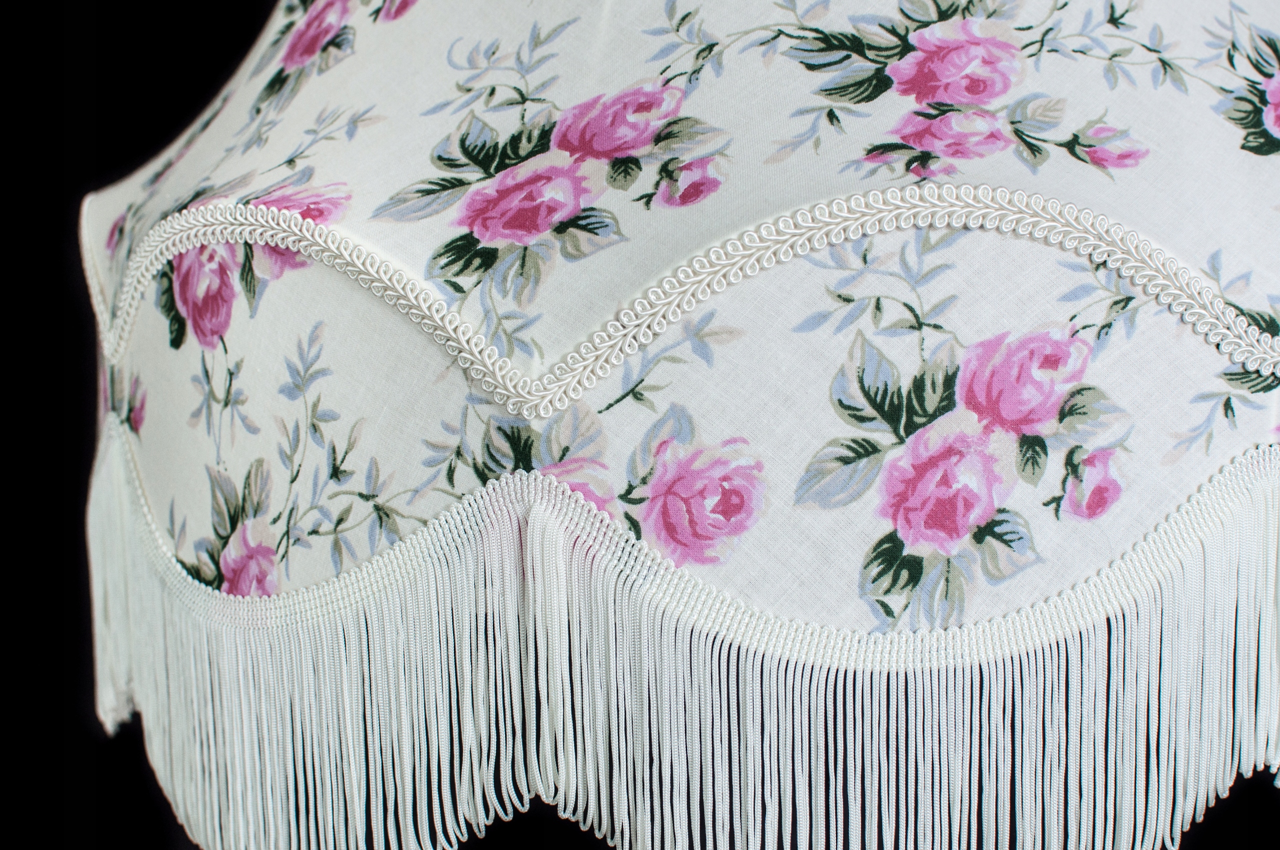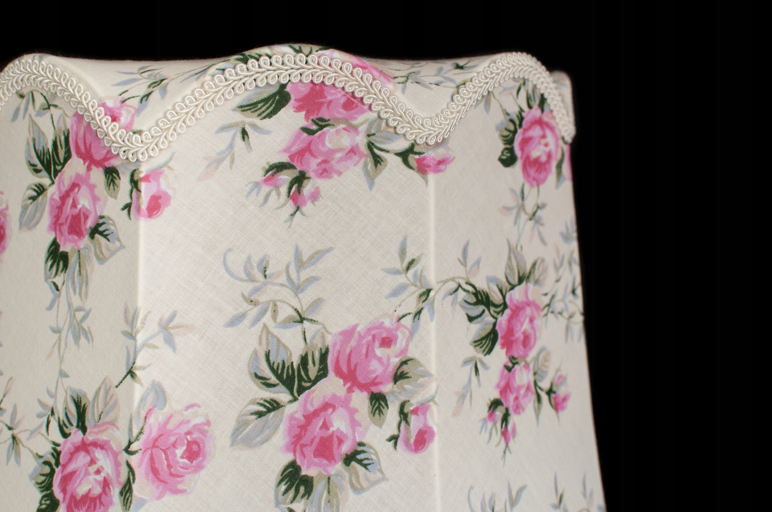 Абажур виготовлений з бавовняної тканини кремового кольору, прикрашений трояндами.