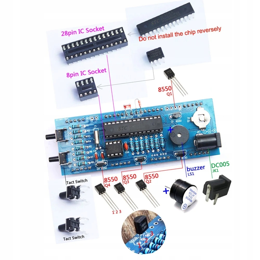 Системи мають на пластині схему друкованої збірки. Вам потрібно звернути увагу на полярність за такі елементи, як конденсатори, діоди, транзистори. У випадку світлодіодів довша нога - це плюс +, більшість елементів описали параметри на корпусі. Резистори можуть мати позначення смужок, їх опір та толерантність можна прочитати за допомогою калькуляторів, доступних в Інтернеті або вимірюванням лічильника. Порядок складання зазвичай безкоштовний, залежно від системи, ми спочатку встановлюємо найменші елементи.