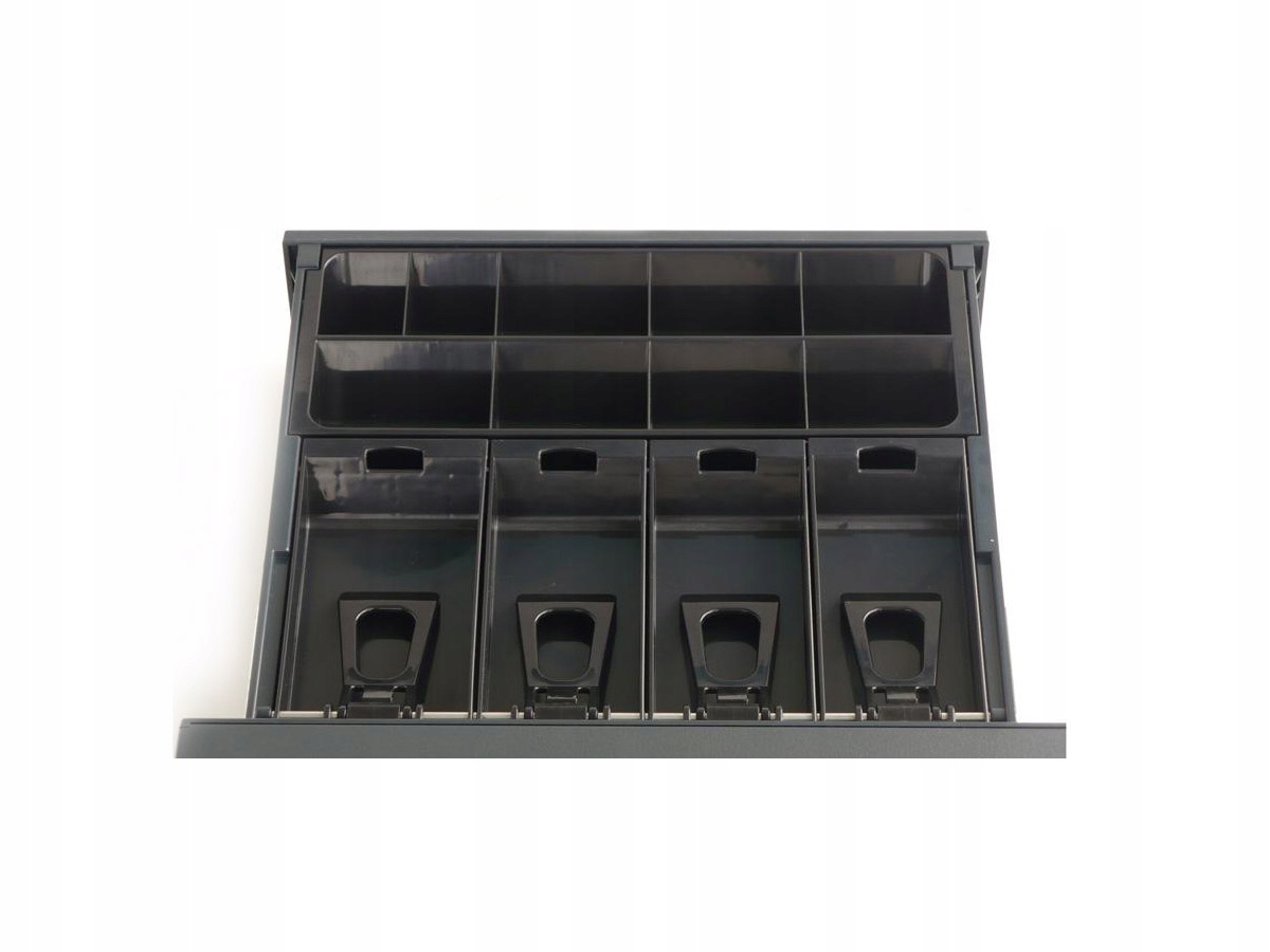 виготовлений з матеріалів найвищої якості. Окремої уваги заслуговує використання металевих кулькових напрямних на візку для ящиків. Вони забезпечують тривалу і надійну роботу, а коляска рухається легко і тихо. Шухляда оснащена 8 відділеннями для банкнот, розміри яких адаптовані до польських злотих і євро, а також знімним контейнером з 9 відділеннями для монет.