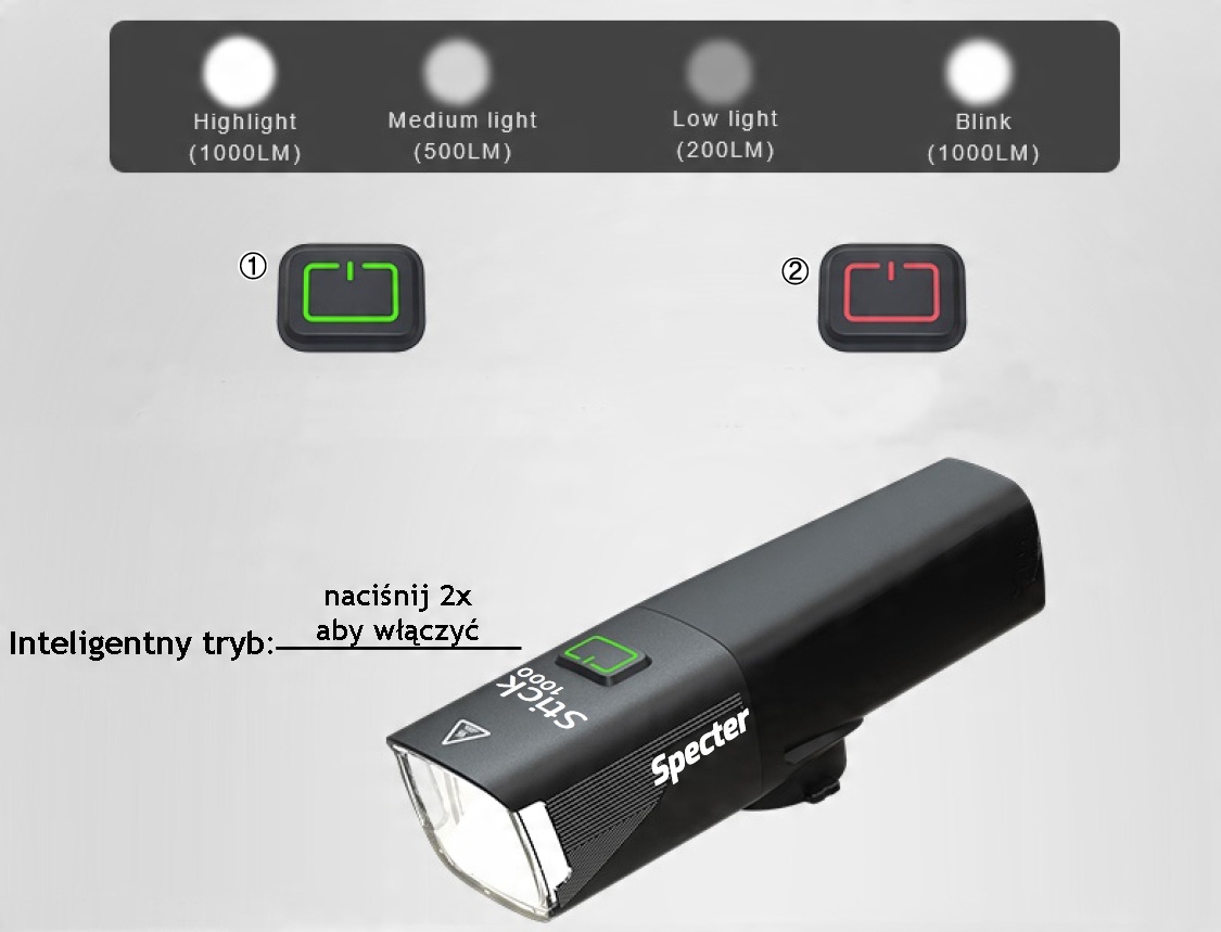Ця модель має вбудовану систему датчиків руху. Під час їзди на велосипеді світло горить у вибраному режимі, після зупинки більше ніж на 10 секунд інтелектуальна функція змушуєStick 1000 перейти в режим сну (вимикається), він увімкнеться лише тоді, коли ви продовжуєте свою подорож. Лампа виявляє навіть найменшу вібрацію та вмикається автоматично.