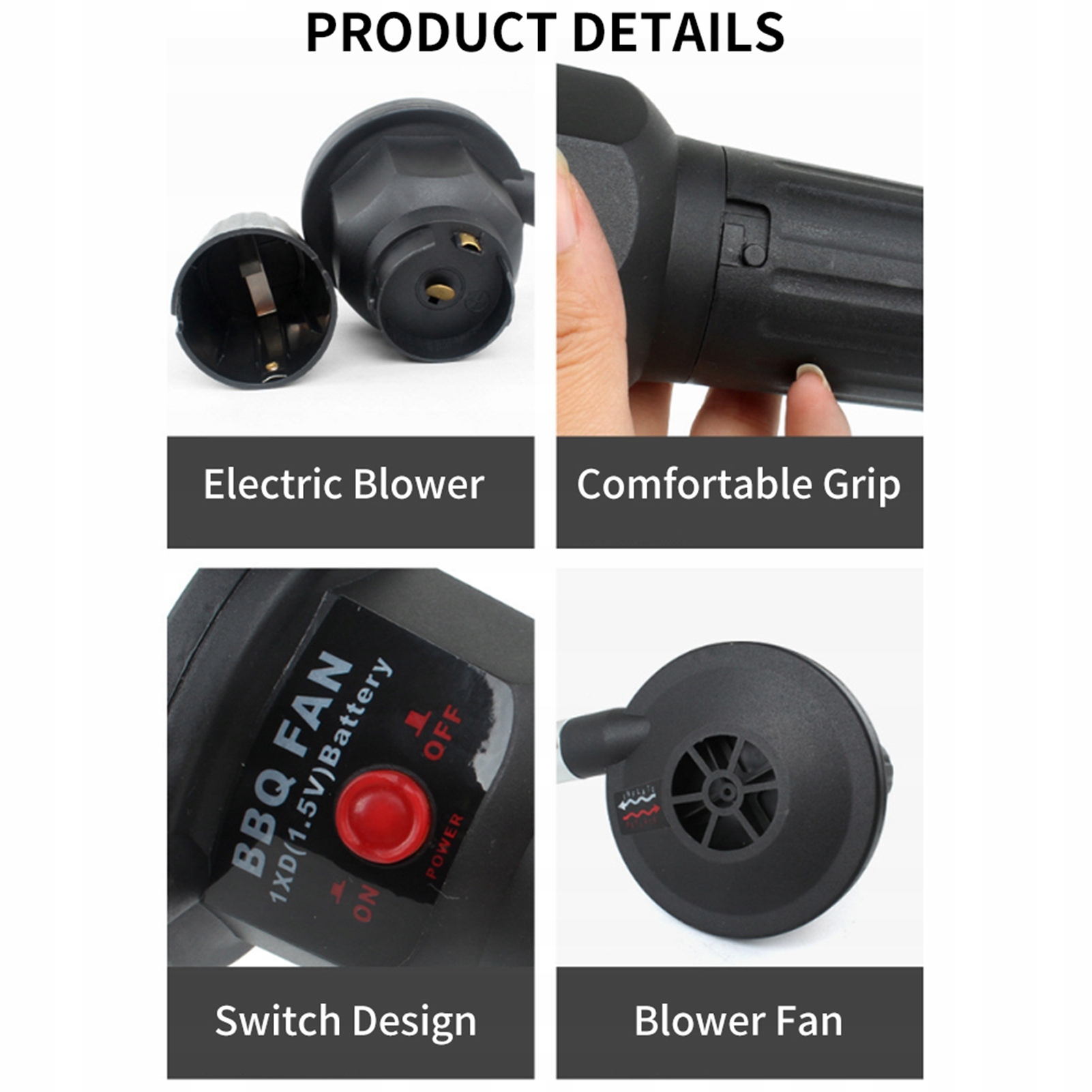 Цей вентилятор електричного гриля легкий, безпечний та надійний. Портативний і легкий, що працює від 1 типу D акумулятора. Він пропонує велику зручність освітлення багаття на вуглецевому грилі, грилі, вогні та каміні.