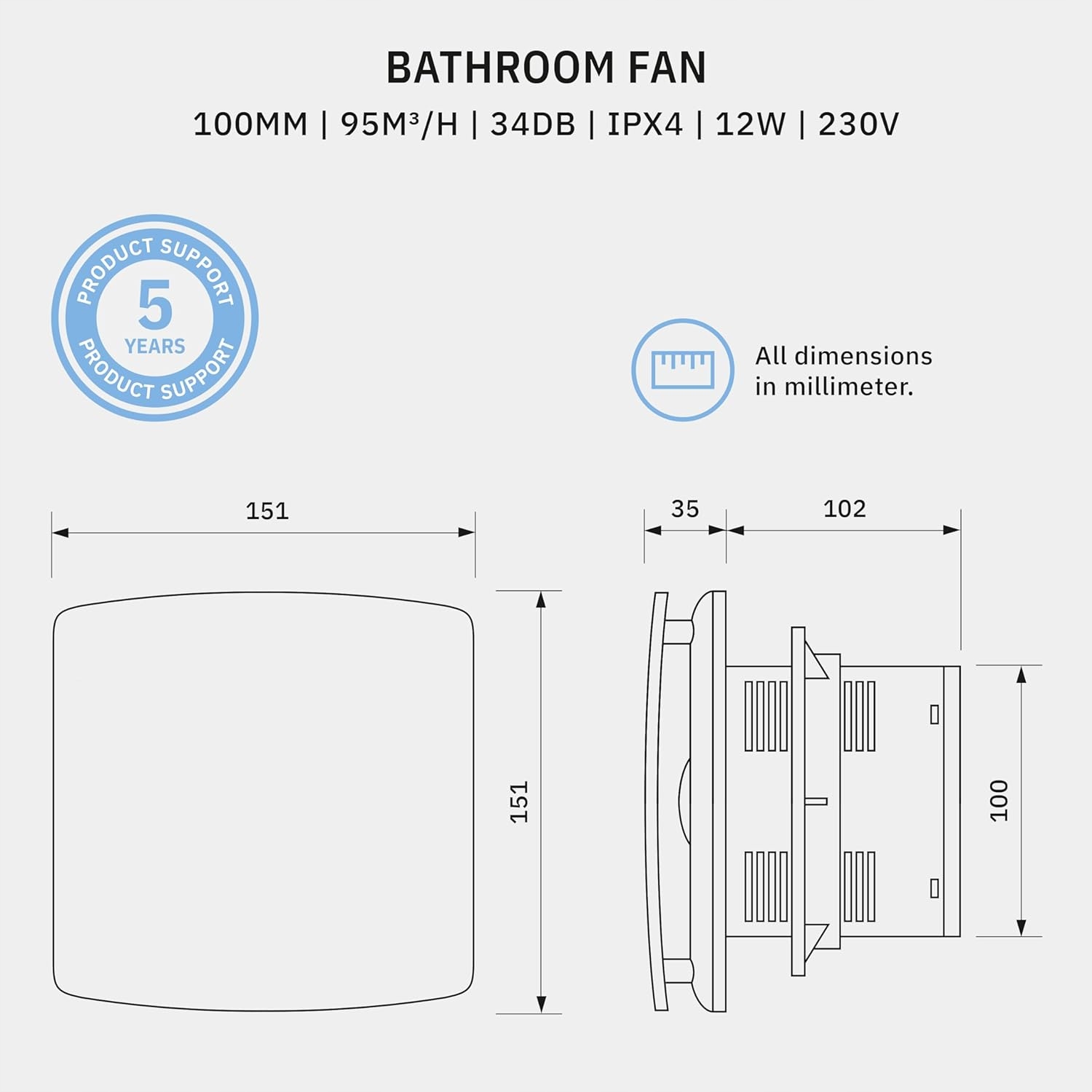 - Наш універсальний вентилятор ванної кімнати ідеально підходить для кімнат з високою вологості. Обкладинка заважає вам заглянути в брудний отвір вентилятора. Ідеально підходить для кімнат різного розміру: туалет (3-4 м²), ванна кімната (3-9 м²), спальня (7-13 м²), кухня (3-7 м²) та офіс (5-13 м²).