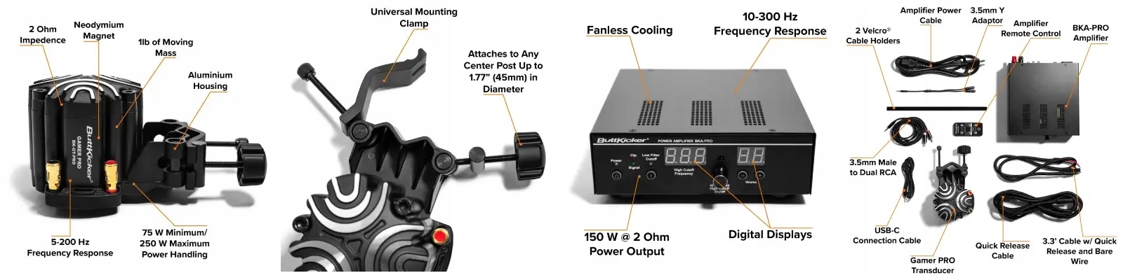 - 150-ватний підсилювач ButtKicker Gamer PRO з бездротовим пультом дистанційного керування.