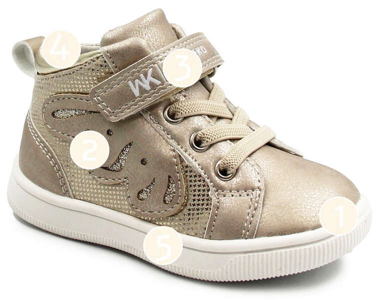шкіряні взуття для дівчат, прикріплене практичним липучком, що дозволяє дитині надіти та видалити. взуття. Інтер'єр виготовлений зі шкіри, що забезпечує адекватну вентиляцію. Поради додатково захищають пальці. Вставка виготовлена з подвійного матеріалу. Він склеюється шаром м'якої піни, що значно покращує комфорт під час використання. Піна, приклеєна під шкірою, забезпечує додаткову подушку, що особливо важливо для активних дітей. Внизу липучки в’яжуть гуму.