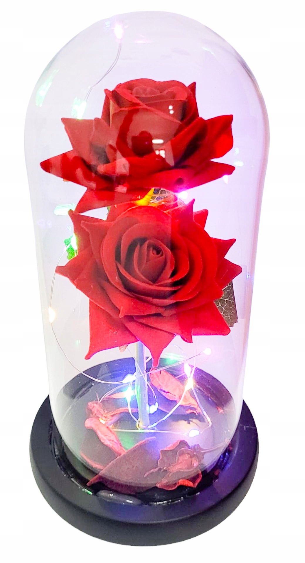 Наша вічна троянда оточена світлодіодними лампочками на дроті, які чудово освітлюють її. Завдяки цьому виглядає надзвичайно ефектно. Поставлений на тумбочку, комод або стіл, квітка створить чарівну атмосферу.