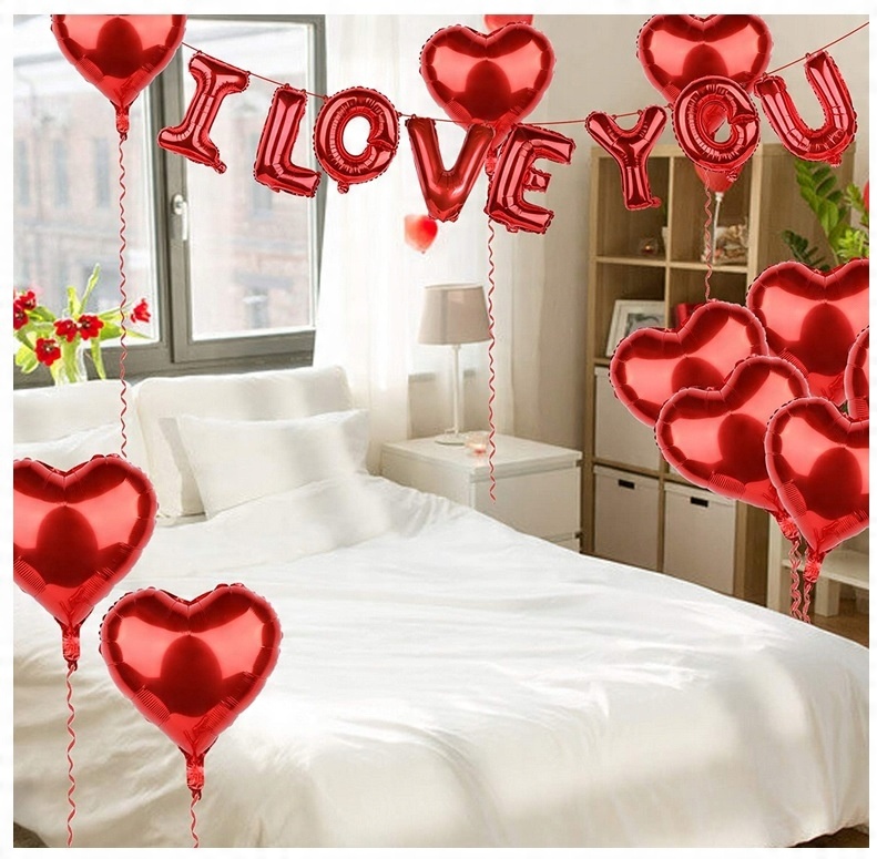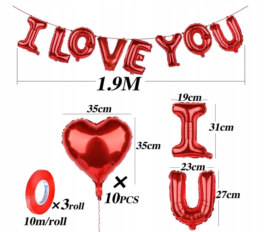У набір входить 1 набір фольгованих літер алфавіту «I Love You», 10 шт (45 см) червоних повітряних куль у формі серця + 3 рулони червоної стрічки по 30 м.