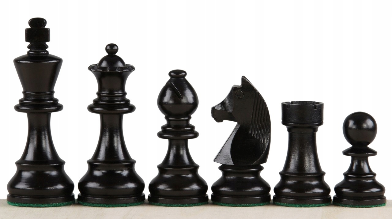 Комплект включає горіхову шахову дошку № 5 з 50 -мм полем без буквено -цифрового опису та гебанізованих фігурних шахів німецький лицар 3,5 дюйма.