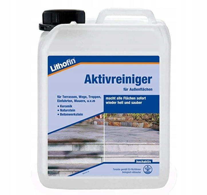 Тип продукту: очисний засіб хлоріну лише на зовнішній стороні дуже активного автоматичного опису інтенсивного, і в той же час ніжне очищення зовнішніх поверхонь, таких як тераси та балкони, стежки, сходи, пандуси, стіни тощо, підходять для керамічних пластин, природних кам'яних паперів, клінкера, клінкера цегли, пластерів та подібних мінералів. Характеристика Активний літофінний очисний засіб автоматично розчиняє загальний бруд, знебарвлення та стійкі родовища. Всі поверхні знову стають яскравими та чистими.