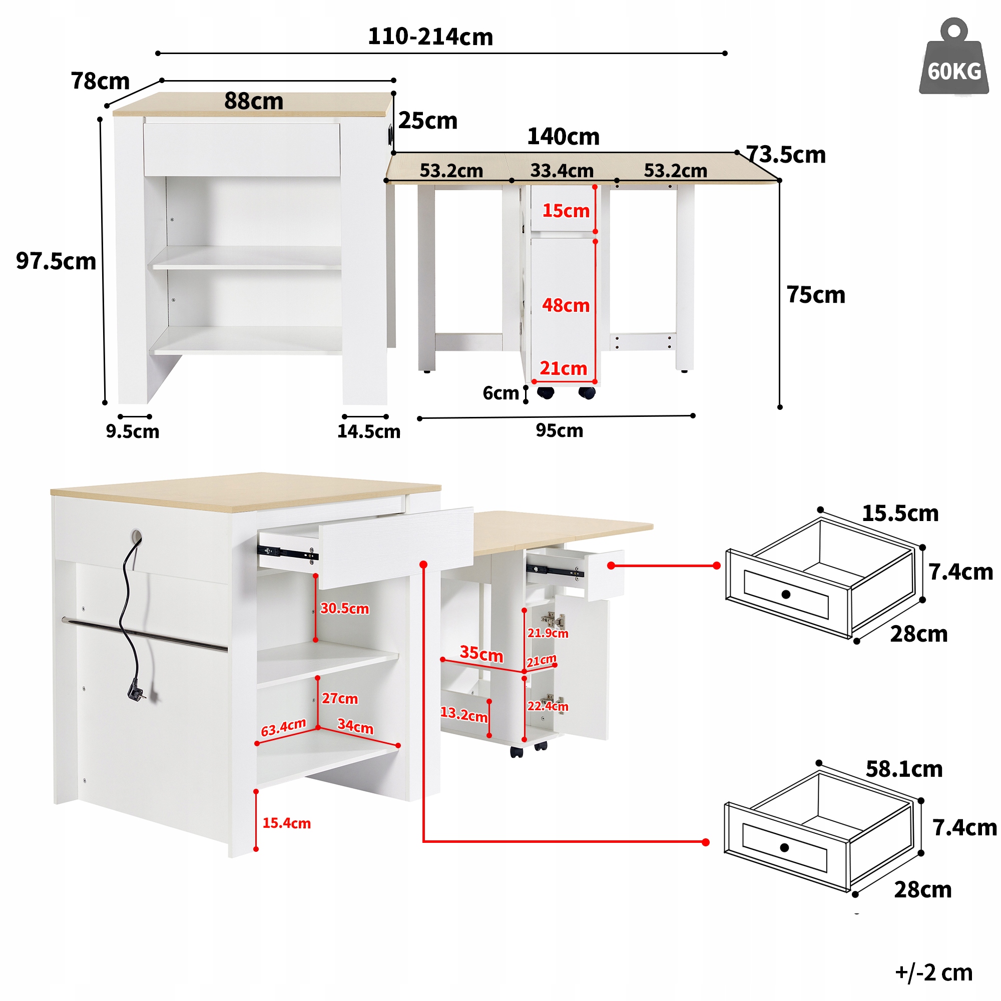 - Розміри продукту: Цей острів столу з шафами завдовжки 110 см, стільницю можна розширити до 214 см, завдяки якому вона може вмістити 4-6 людей, ширина 78 см, висота 97,5 см, ідеально підходить для зберігання речей сім’єю та для споживання їжі!
