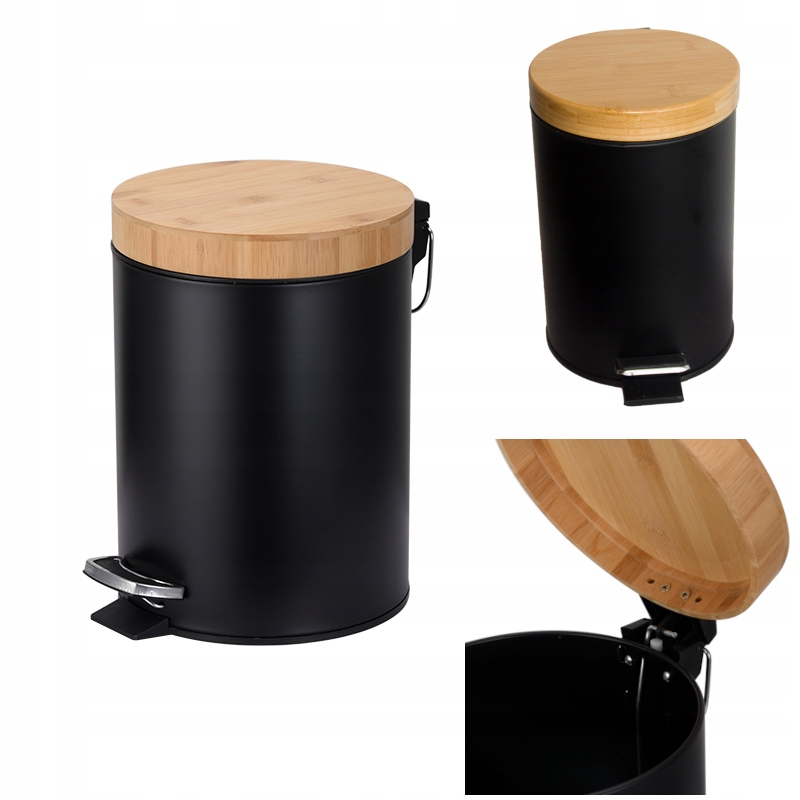 Елегантний невеликий контейнер для сміття об'ємом 3 л з бамбуковою кришкою, що відкривається педаллю, модного чорного кольору.