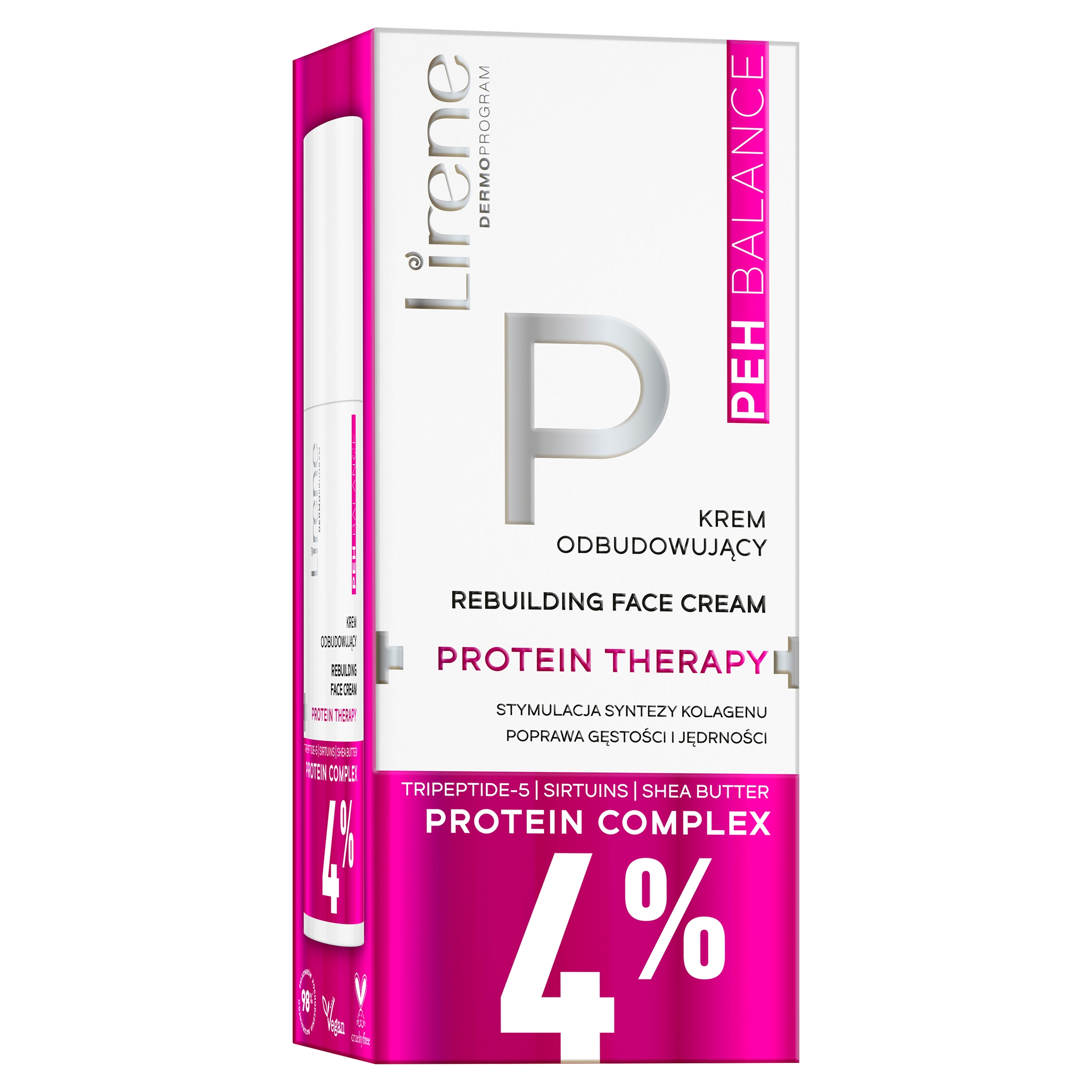 Спосіб застосування: Нанести крем масажними рухами на очищену шкіру обличчя та шиї. Підходить для денного та нічного використання. Вибирайте та комбінуйте продукти Lirene із серій PEH та PEH+ залежно від ваших поточних потреб.