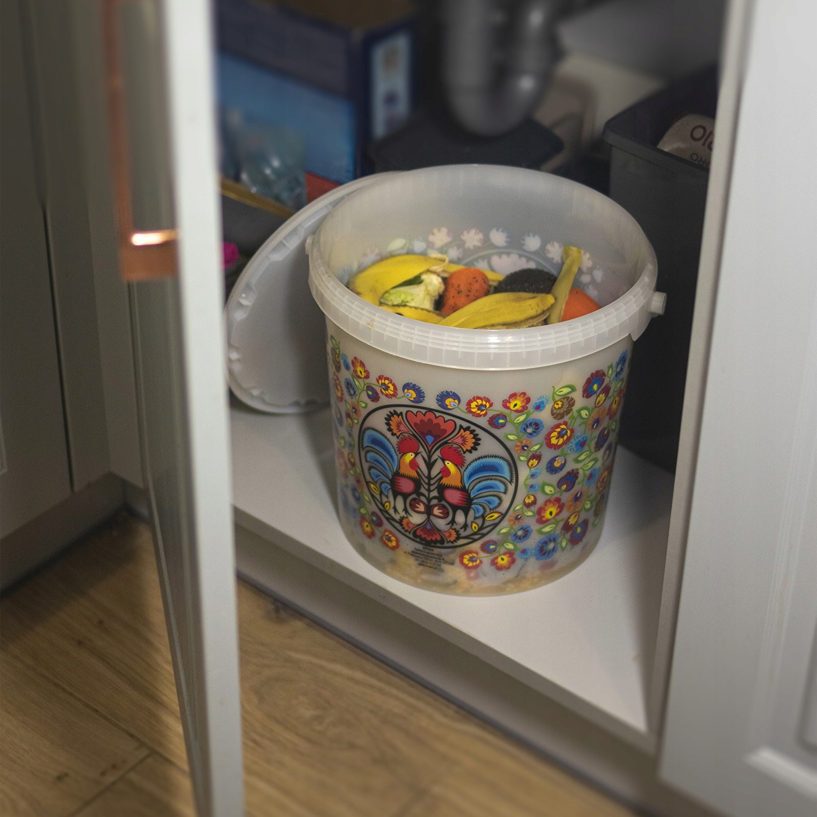 GWIOZDA - це один із трьох типів витинанок з Ловича, які здавна були декоративним елементом в інтер'єрах селянських хат. . Ми вирішили перенести традицію на наше зручне і міцне відерце для їжі, принісши його до вас додому. Відро ідеально підходить не тільки для приготування їжі в домогосподарствах і закладах громадського харчування (наприклад, для соління капусти або сушіння м'яса), але і в садах під час прибирання. Відерце з міцною конструкцією і красивим барвистим принтом, завдяки своїй функціональності та декоративності, чудово підійде і в дитячій кімнаті - як контейнер для іграшок або кубиків. Діти також можуть успішно використовувати його під час канікул, наприклад, на пляжі - маючи з собою свої лопатки та форми, необхідні для будівництва замків з піску! Завдяки великій місткості відро також можна використовувати як контейнер для біосміття та компостер. Зручна складна ручка і кришка дозволяють брати відро на вулицю - наприклад, збирати гриби, рибу або в сад. Ви також можете наповнити своє відерце банками з домашньою консервацією, з кришками, що загвинчуються у моделі Фольк - з таким же дизайном! Безсумнівно одне - харчове відерце GWIOZDA - це універсальна ємність, яка підійде в багатьох ситуаціях, а головне - завжди матиме чудовий вигляд.
