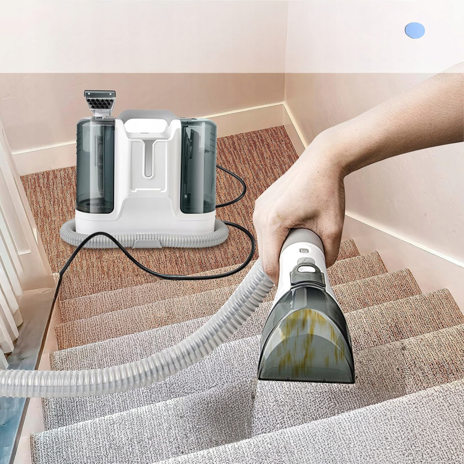 Пристрій очищення килимів оснащений двигуном 450 Вт, що забезпечує високу силу всмоктування. Наша оббивка пилососа швидко та точно видаляє стійкі запахи, різні види плям та бруду, такі як грязь, вино, смаку тварини та інші, з килимів та оббивки. Його можна використовувати на килимах, сходах, оббивці, диванах, автомобільних інтер'єрах тощо. Він швидко видалить розлиті рідини і надасть своєму будинку новий вигляд.