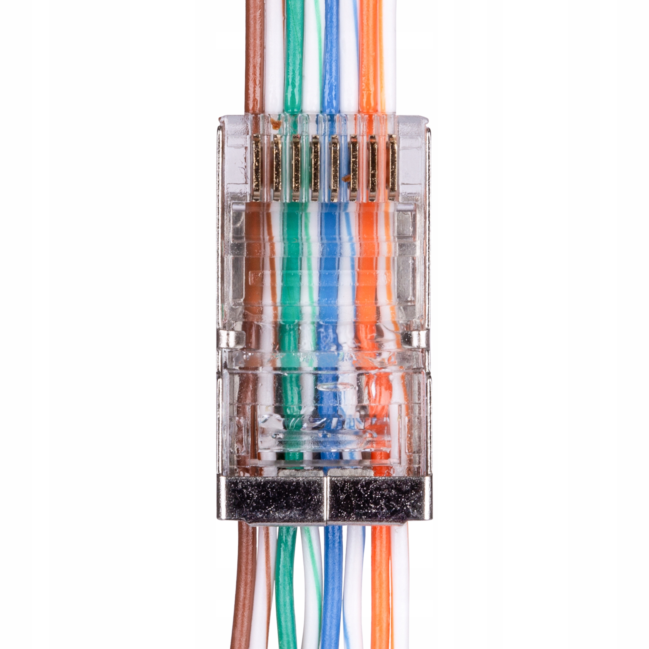 Вісьмиконтактні мережеві роз’єми RJ45 у системі Pass Through. Використовується для закінчення кабелів витої пари в комп’ютерних мережах. Вони гарантують набагато кращий і точніший затиск, ніж традиційні заглушки.