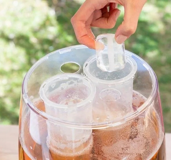 Зручний дистриб'ютор охолоджувальних напоїв ідеально підходить для подачі всіляких напоїв на вечірках та урочистостях з близькими людьми. У ньому є 2 окремі знімні контейнери для льоду, розміщені в центральній частині камери, яка охолоджується і зберігає напій при низькій температурі, а не їх відлікуючи. Ємність цього оригінального та універсального дозатора дуже велика, це 4 л, тоді як вживанням резервуара прозорий, тому ви можете контролювати кількість решти напою і додати його в будь -який час. Його практичний кран з важелем дозволяє подавати напої аналогічно, як використання професійних пивних тинкторів: легко, комфортно, без розливу та капання. Просто нахиліть важіль вниз, щоб запустити кран, і налийте напій або натисніть його вгору, щоб зупинити потік. Його можна використовувати в приміщенні та на відкритому повітрі, підходячи для багатьох видів напоїв, таких як пиво, сангрія, мохіто, коктейлі, заморожений чай тощо. Крім того, він дуже простий у використанні. Його можна розгорнути, що полегшує очищення та зберігання, воно займає мінімальну поверхню. Набір не включає окуляри.
