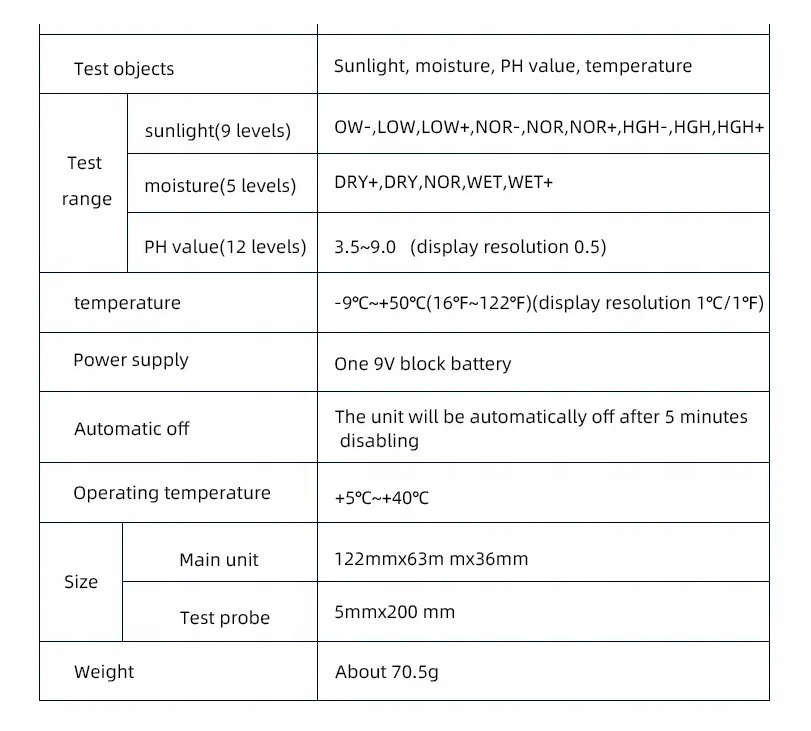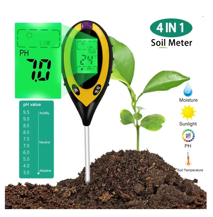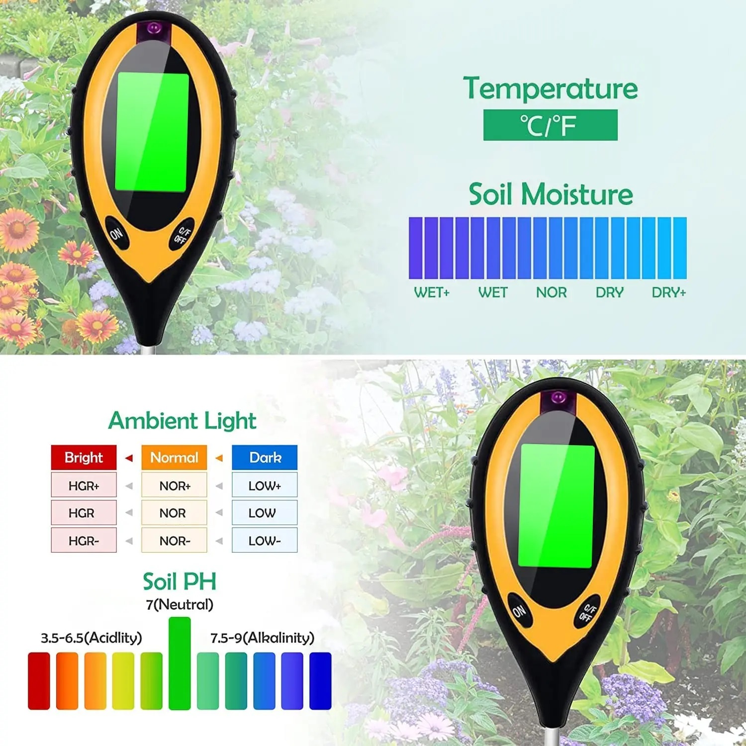 Тест ґрунту 4 в 1 може випробувати вологість, значення рН, температуру та інтенсивність сонячного світла в ґрунтовому середовищі, що зручніше.
