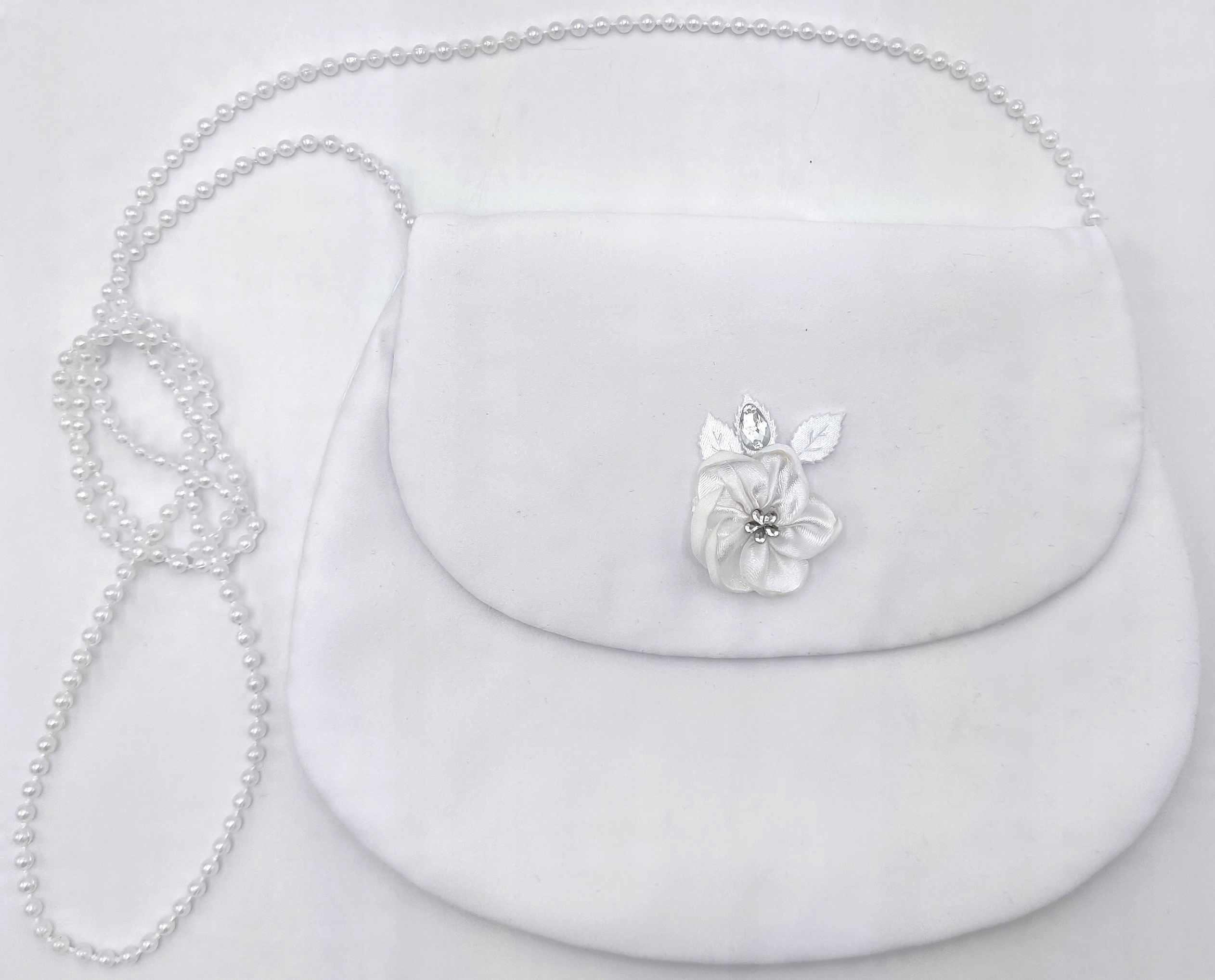 Мішок для причастяє ефектним доповненням до святкового вбрання. Виготовлена з білого атласу. Сумка має підкладку, застібається на липучку і посилена, що зберігає природну форму. Гарна квітка, яка входить до комплекту з вінком і браслетом, додає шарму. Нею була прикрашена передня частина сумки. Ремінець виготовлений з ланцюжка з бісеру, довжиною приблизно 1 метр, що дозволяє вільно носити сумку через плече. Розміри сумки: ширина 22 см, висота 17 см.