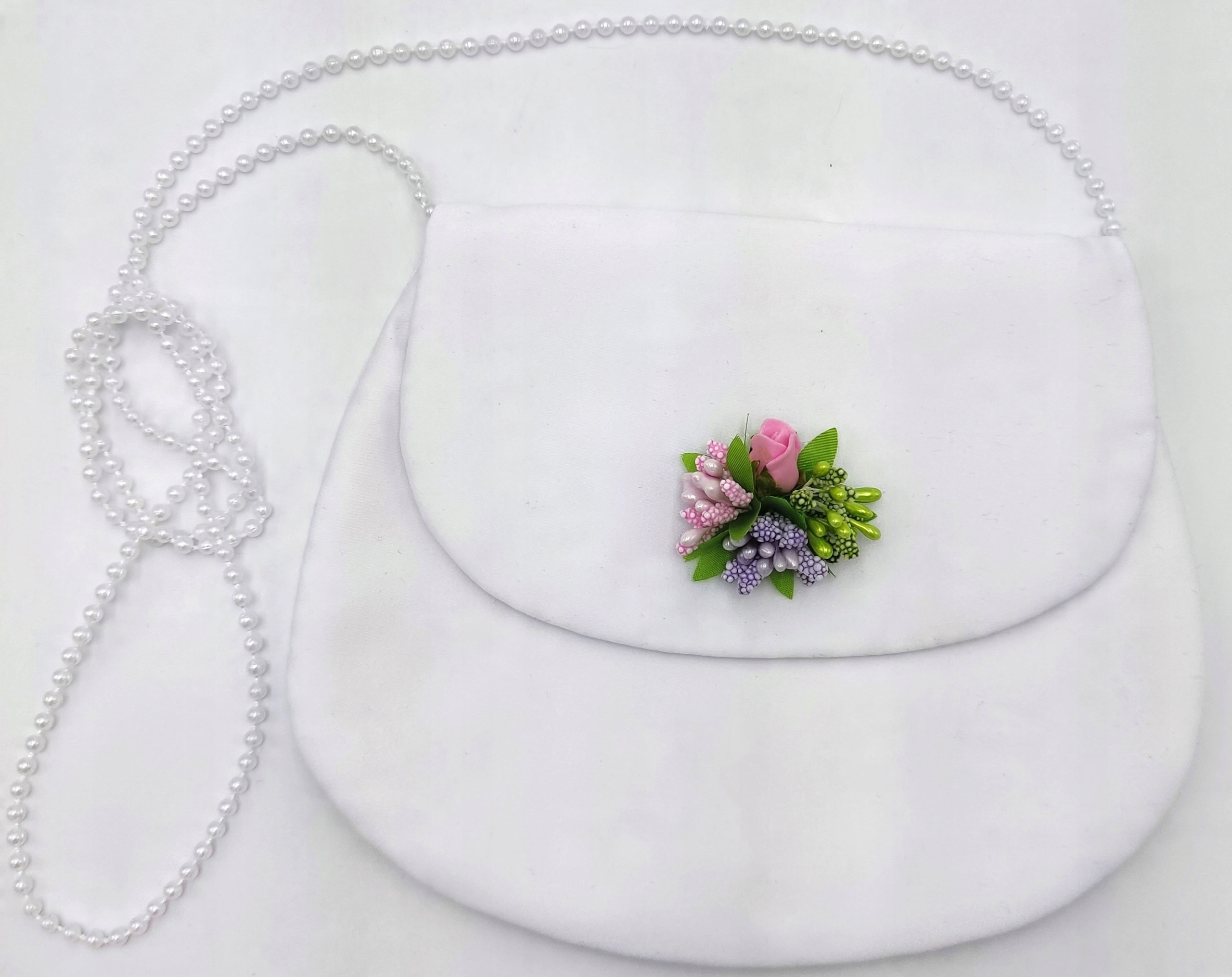 Мішок для причастяє ефектним доповненням до святкового вбрання. Виготовлена з білого атласу. Сумка має підкладку, застібається на липучку і посилена, що зберігає природну форму. Гарна квітка, яка входить до комплекту з вінком і браслетом, додає шарму. Нею була прикрашена передня частина сумки. Ремінець виготовлений з ланцюжка з бісеру, довжиною приблизно 1 метр, що дозволяє вільно носити сумку через плече. Розміри сумки: ширина 22 см, висота 17 см.