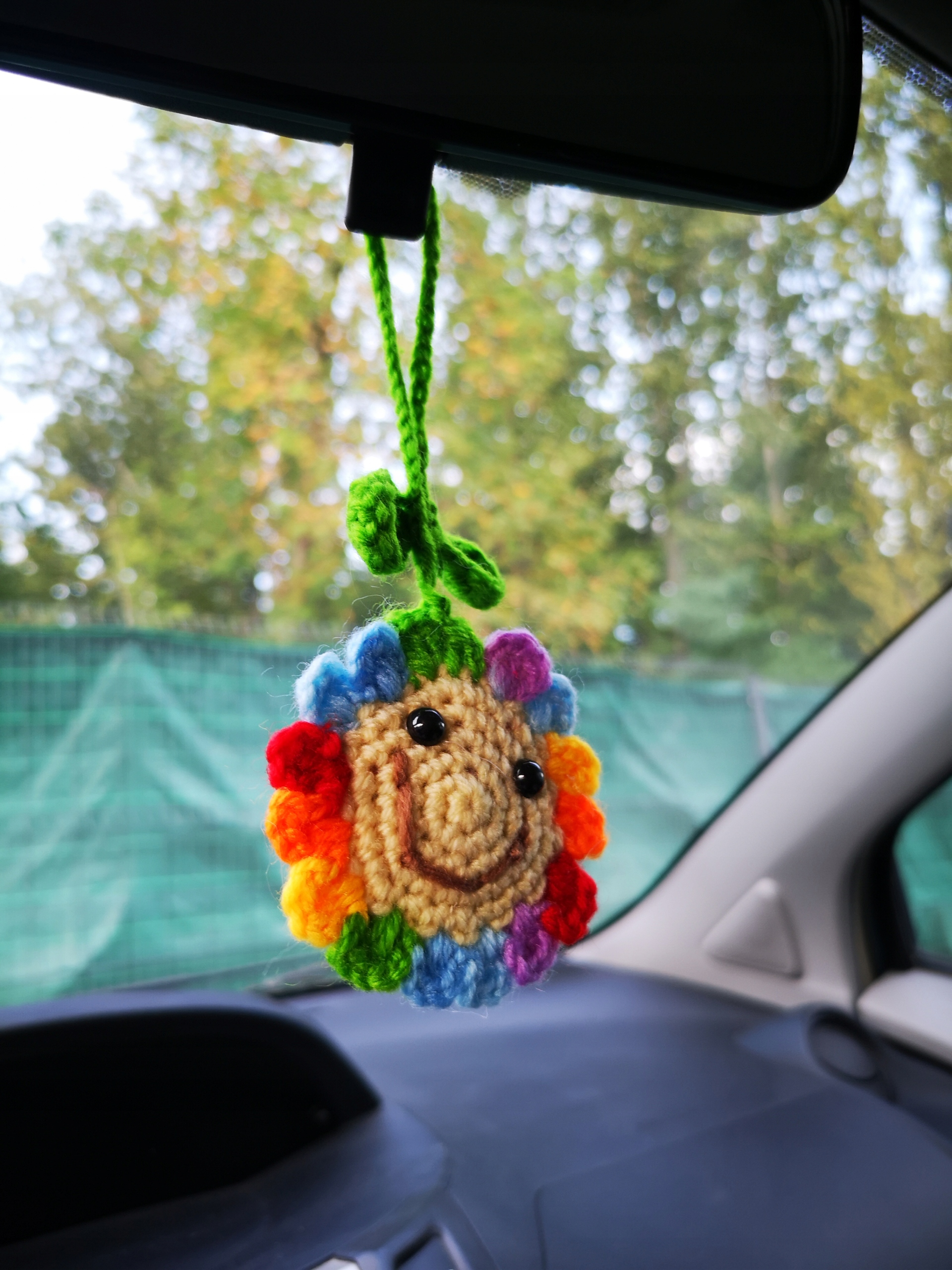 Гарна вишита різнобарвна квітка , посередині також є очі та посмішка. Додатково 2 маленьких листочка на шнурку для підвішування. Вічна прикраса як для автомобіля, так і для інших місць.