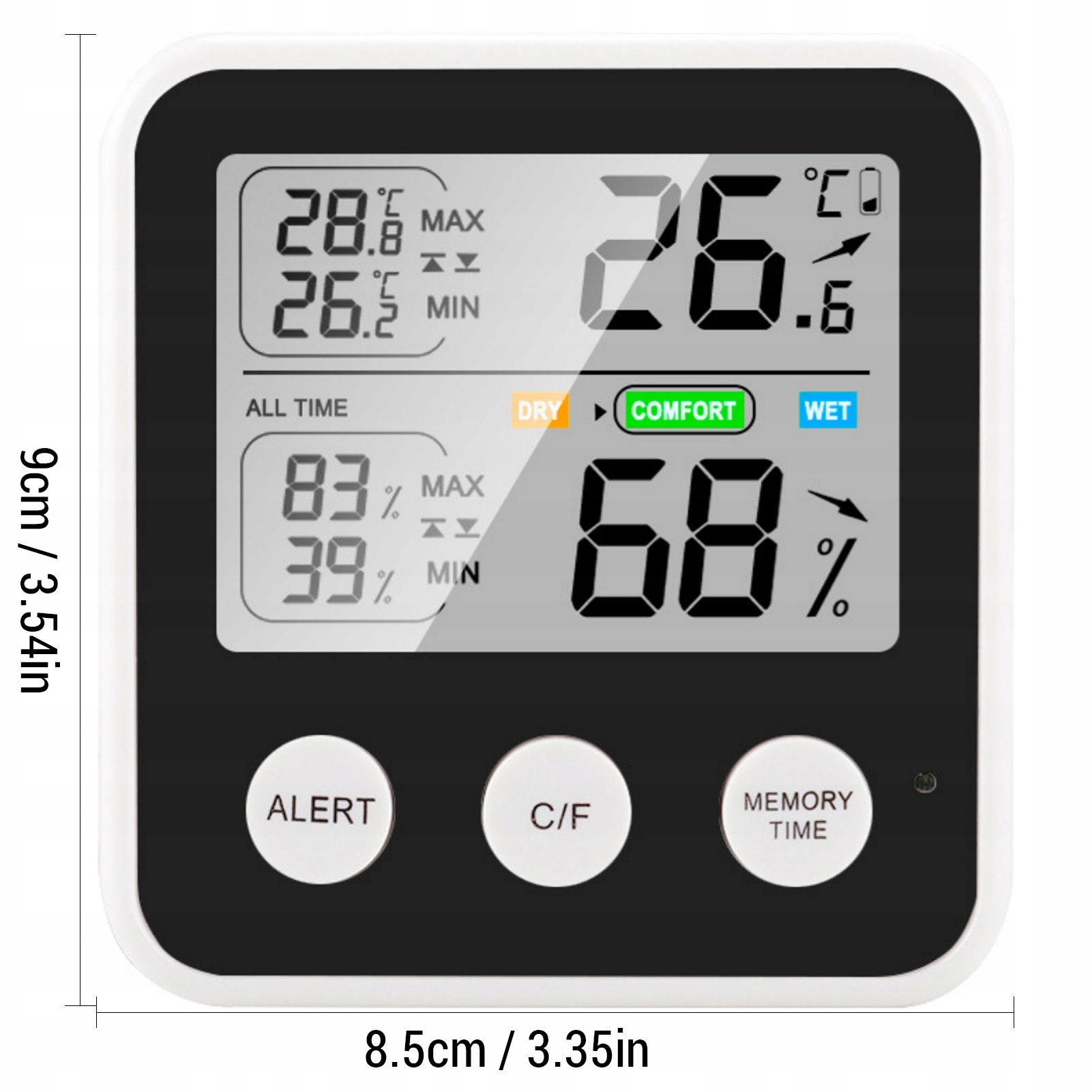 - [Високоякісні матеріали], виготовлені з вибраного матеріалу ABS, оболонка набагато вища якість для запобігання пожовкам. Також може виявити максимальні та мінімальні значення температури та вологості за 24 години, а стрілка тенденції в режимі реального часу відображається на екрані РК-екрана. дегуміфікують. (Сухе: нижче 50%RH, комфорт: 50%~ 70%RH, WET: понад 70%RH).