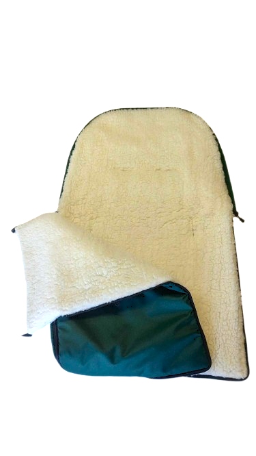 Сплячий мішок виготовлений з водонепроникної, стійкої до витирання тканини для інвалідного візка. Внутрішня частина спального мішка вистелена екологічним хутром. "Вовна овець". Всередині його ізольовано антиалергічним яйцем. Універсальний візерунок робить спальний мішок для більшості дитячих коробок та місць на ринку.