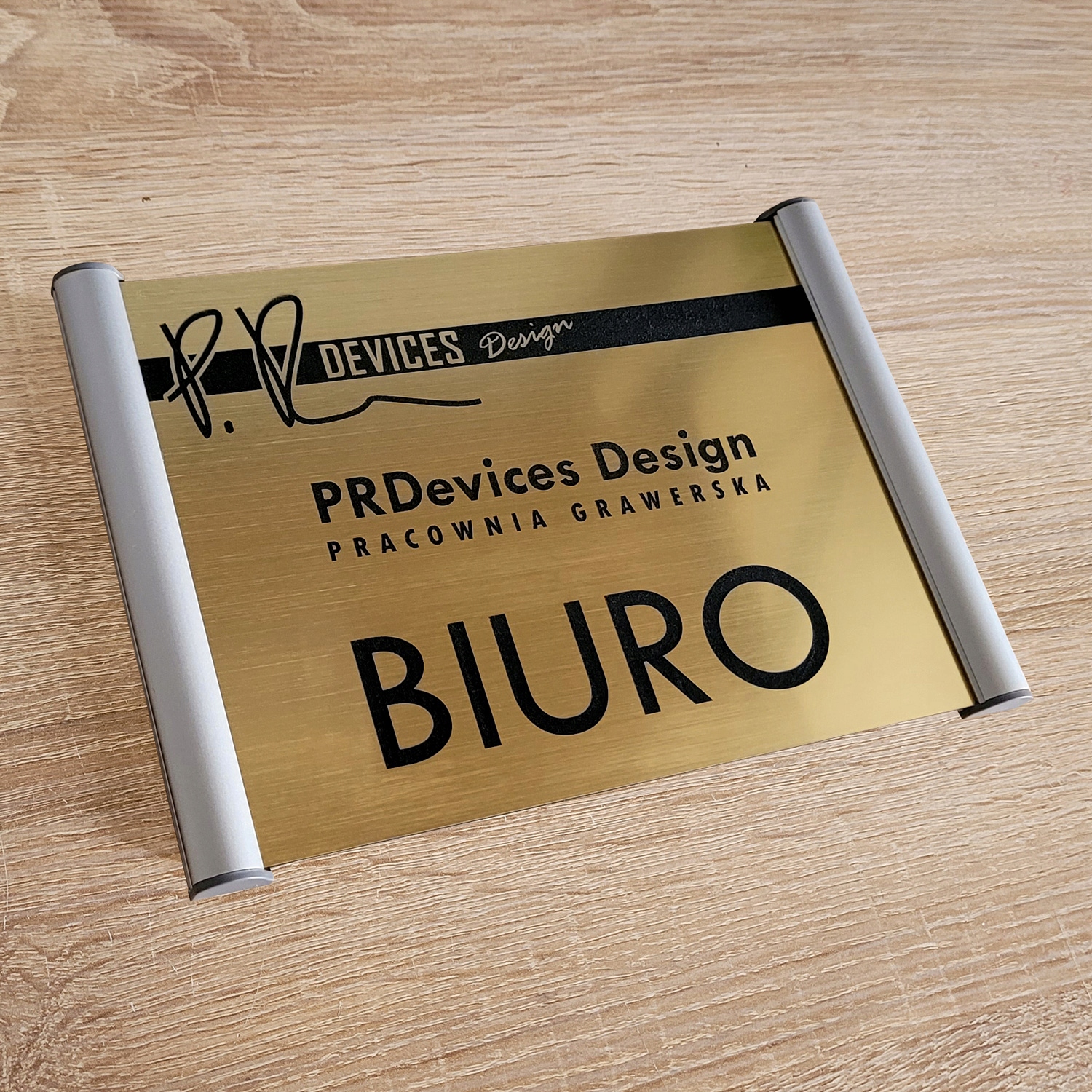 табличка з незначним мінімалістичним стилем, що поєднує алюмінієву раму з чорним гравіруванням ламінату - білою гравюром.