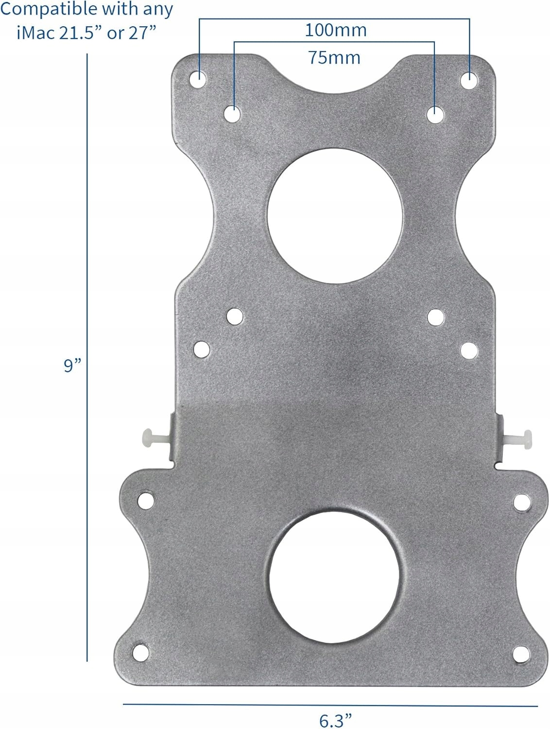 Міжнародні продукти підлягають окремим положенням і умовам, продаються з-за кордону та можуть відрізнятися за певними характеристиками, як-от розміром, віковим рейтингом, етикеткою чи мовою інструкцій. Проста установка – використовується унікальна запатентована система перехідних кілець. У набір входять гвинти, шайби тощо, необхідні для правильного встановлення. Склад: виготовлена зі сталі кольору металевий алюміній. Важить всього 0,7 кг. Дизайн – адаптер призначений для Apple iMac. Призначений для підтримки ваги та масштабу дисплея iMac і для підставок 75 x 75 мм або 100 x 100 мм. Сумісність – запатентований набір адаптерів VESA для Apple iMac (сумісний лише з дисплеями 21,5" і 27"). Сумісність з кінця 2009 року до поточних моделей (включаючи новий дисплей Retina 5K).