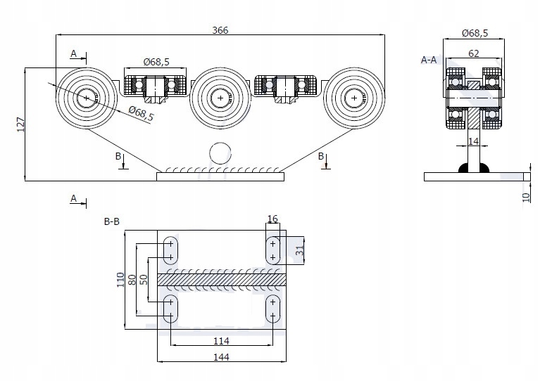 Візок 8 роликовий, фіксований, без регулювання висоти, для відкатних воріт, підвісних дверей і т.д., для профілю 80x80 мм зі стінкою 5 мм.