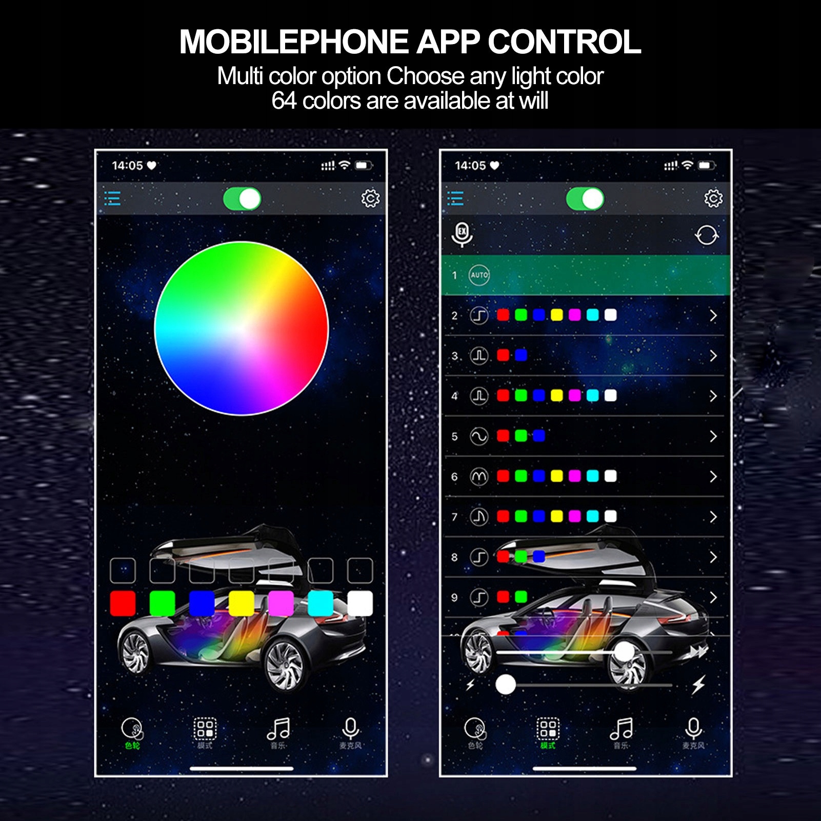 3. Багато кольорів: Цей світлодіодний ремінь RGB RGB має 64 кольори самостійно та інший режим вибору, який ви можете встановити власні унікальні кольорові режими для покращення внутрішньої обробки автомобіля.