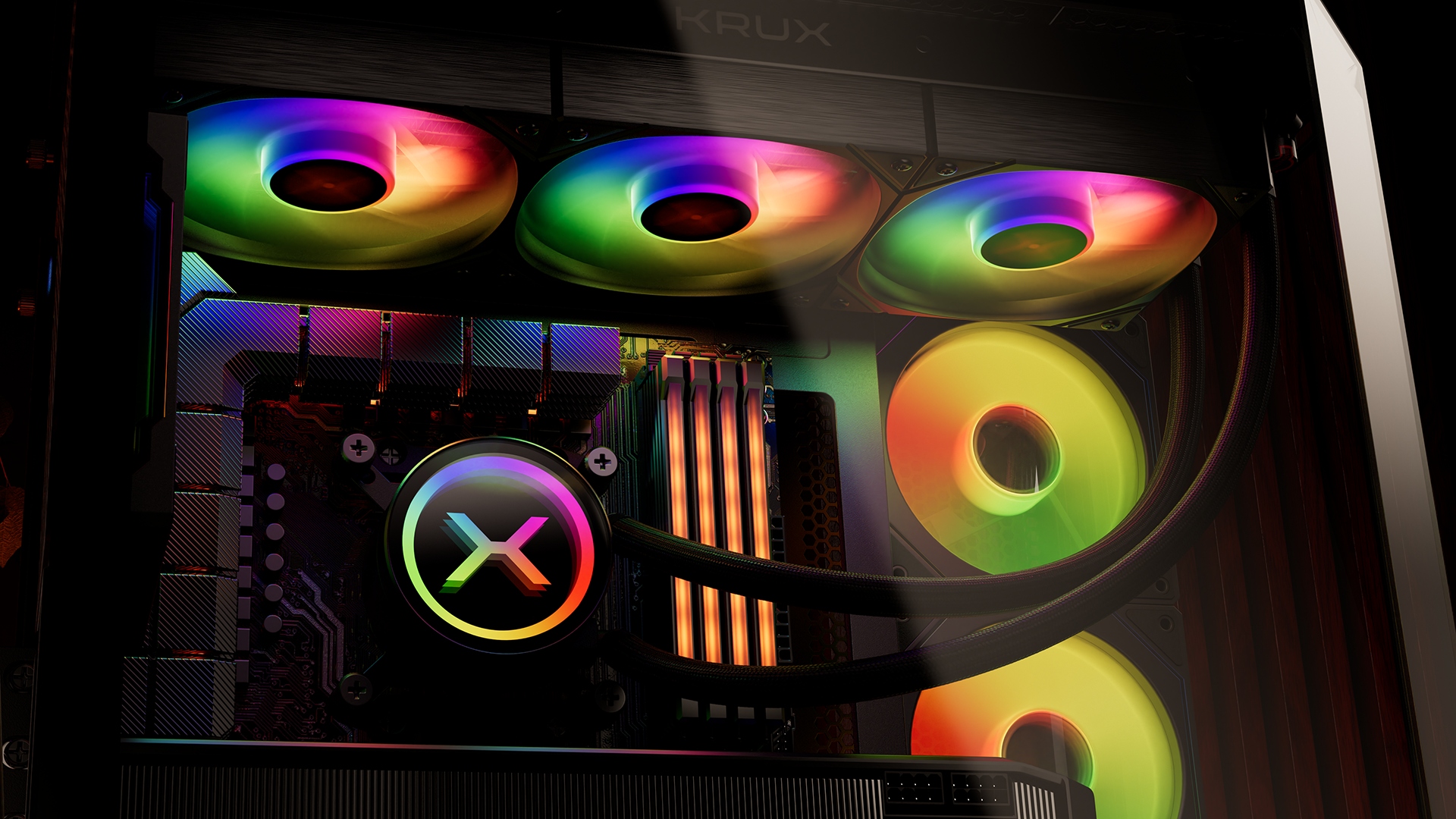 оптимізований для ефективного потоку повітря. Структура підтримує низькі температури процесора навіть під час інтенсивного навантаження у складних умовах. Мідний водний блок забезпечує швидку передачу тепла від процесора до рідини, а 3 вентилятори ARGB Krux 120 PWM та алюмінієвий 360 мм алюмінієвого охолоджувача ефективно охолоджують його.