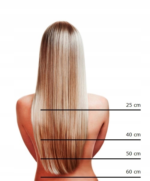 На фотографії поруч показано, де волосся, яке ми продаємо в різних пропозиціях з 25 см, 40 см, 50 см і 60 см. Дане порівняння було підготовлено для людини з висотою 165 см.