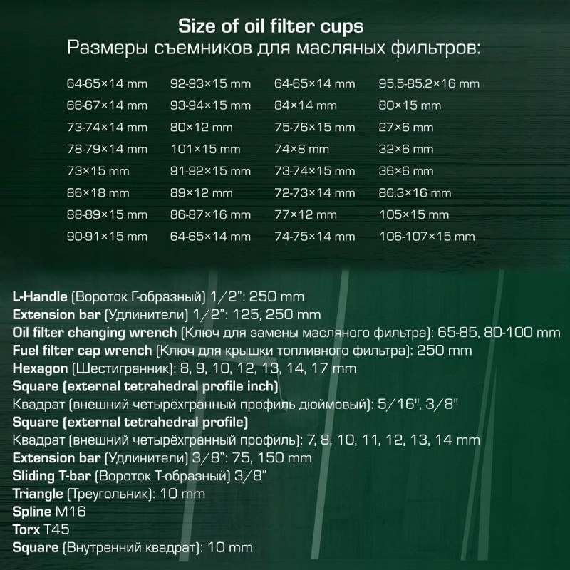 Крім того, в набір входять інструменти для зняття масляних фільтрів різних розмірів, гнізда для зняття масляних ковпачків та інші інструменти, призначені для роботи з масляними системами автомобіля. .