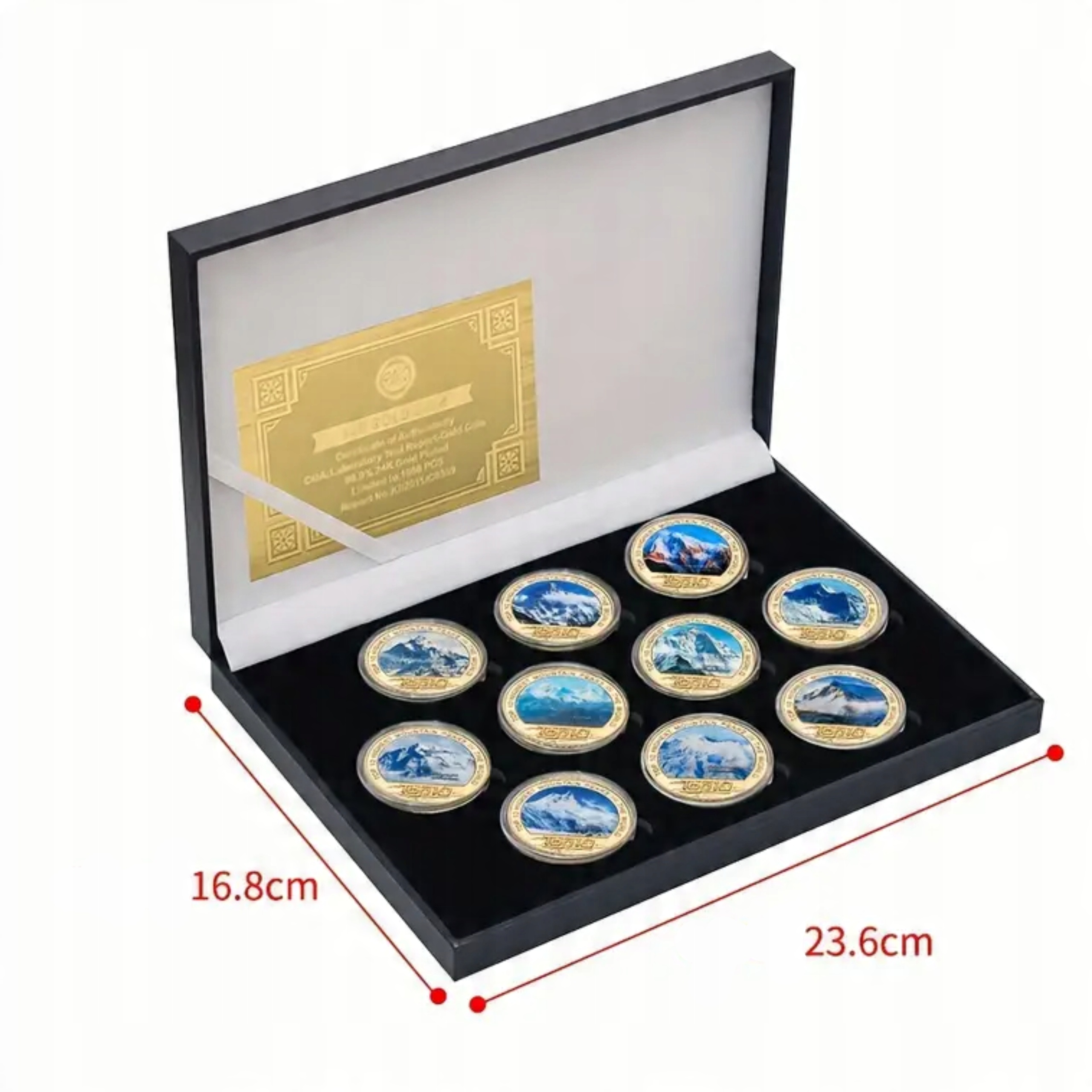 Ми представляємо елегантний набір з 10 реплік монети, що відзначають найвищі гори світу - ідеально підходить для колекціонерів, любителів природи, мандрівників та ентузіастів гірських викликів. Кожна монета представляє одну з найвищих гір (включаючи гору Еверест, K2, Kangchenjunga) - точно зроблений з чітким полегшенням і позначеним іменем та висотою.