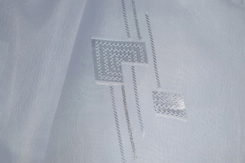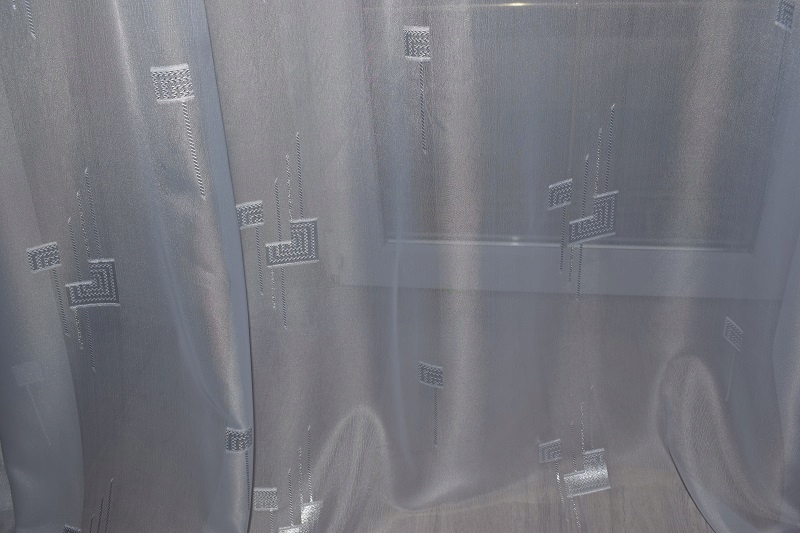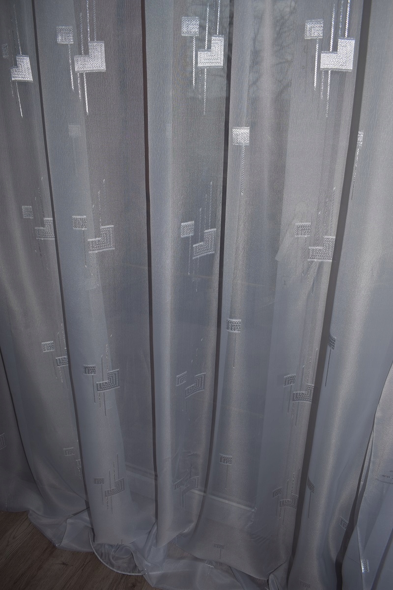 Пропонуємо Вашій увазі білу вуальну штору (холодного відтінку білого, але не синього) з декоративними білими аплікаціями, розташованими вертикально. Аплікації вбудовані в тканину вуаль, вони не фарбовані та не розфарбовані.