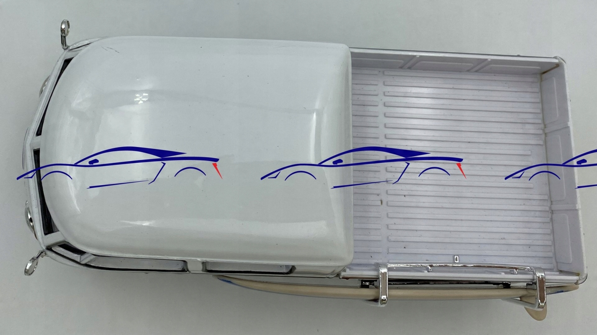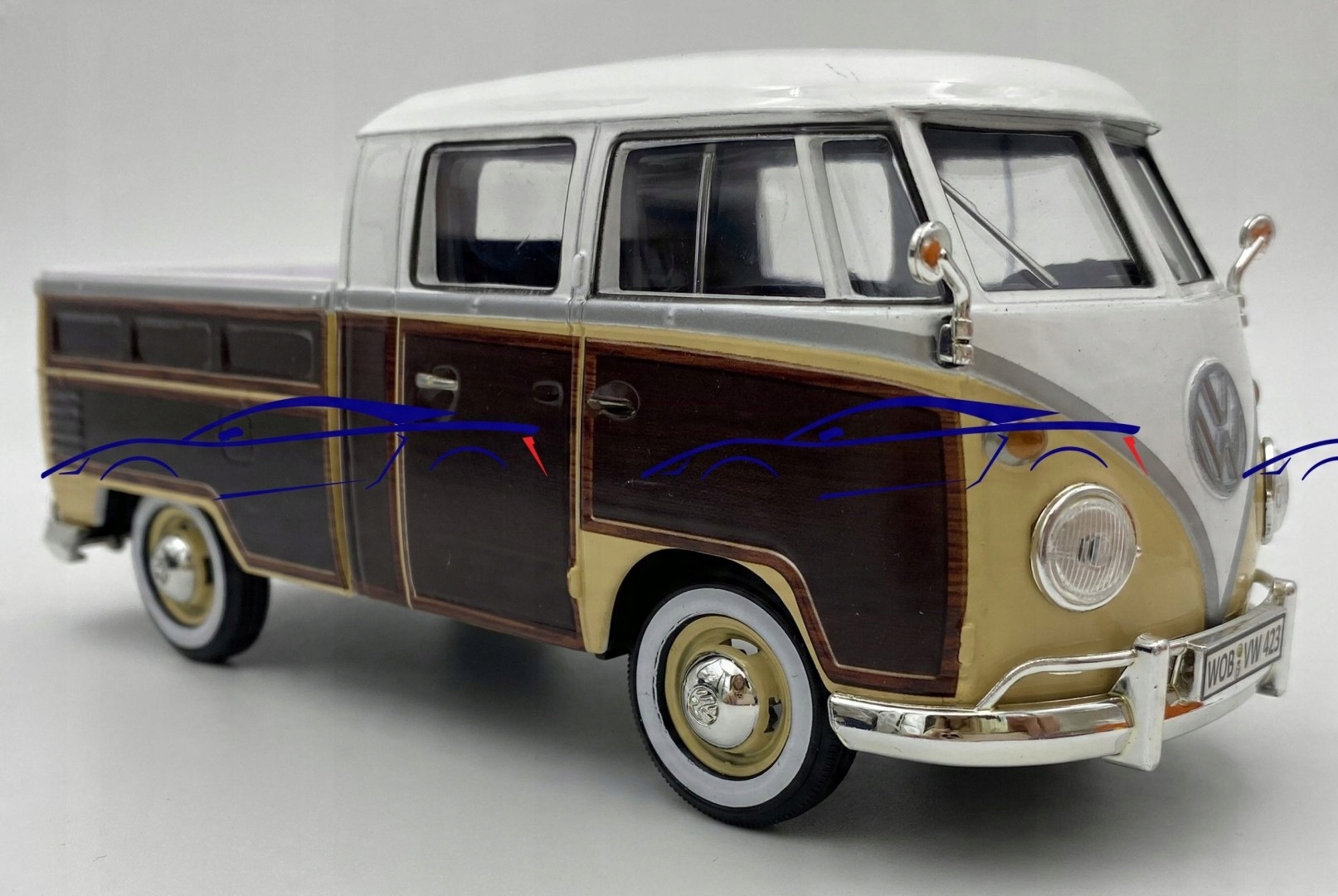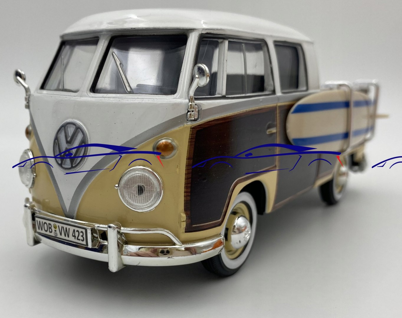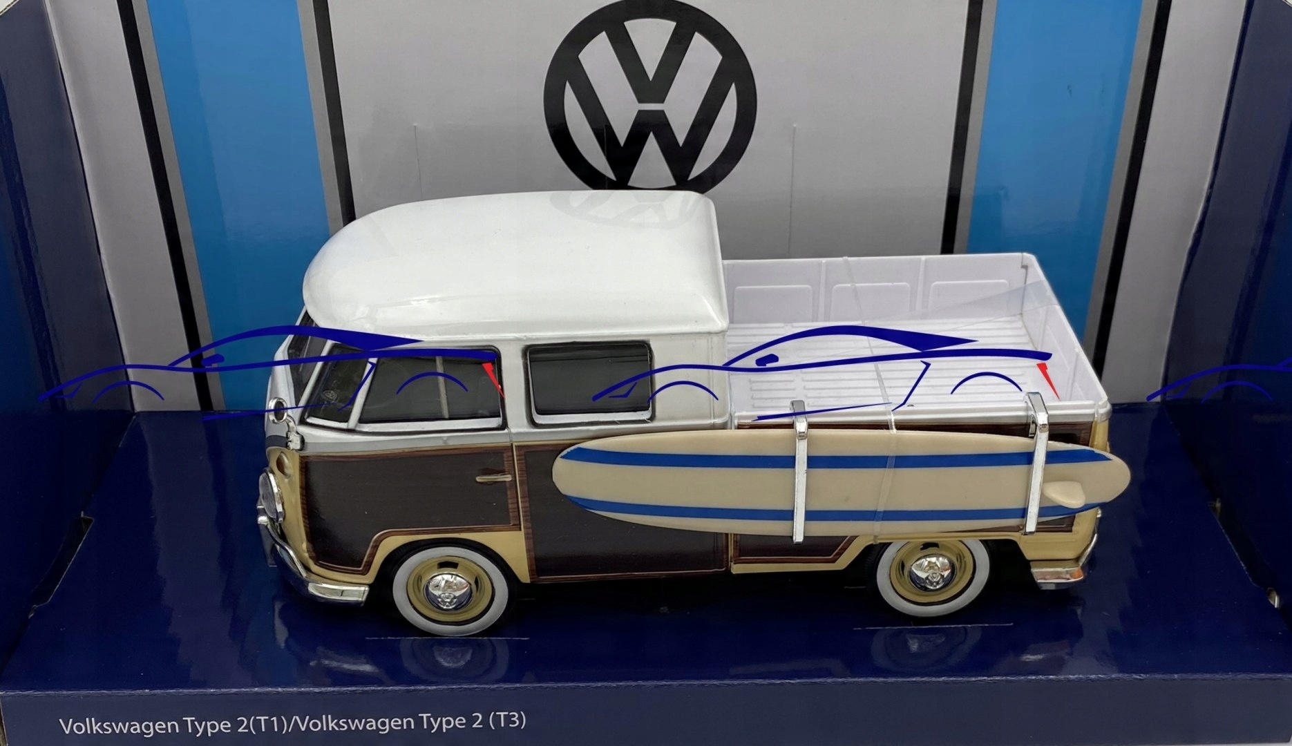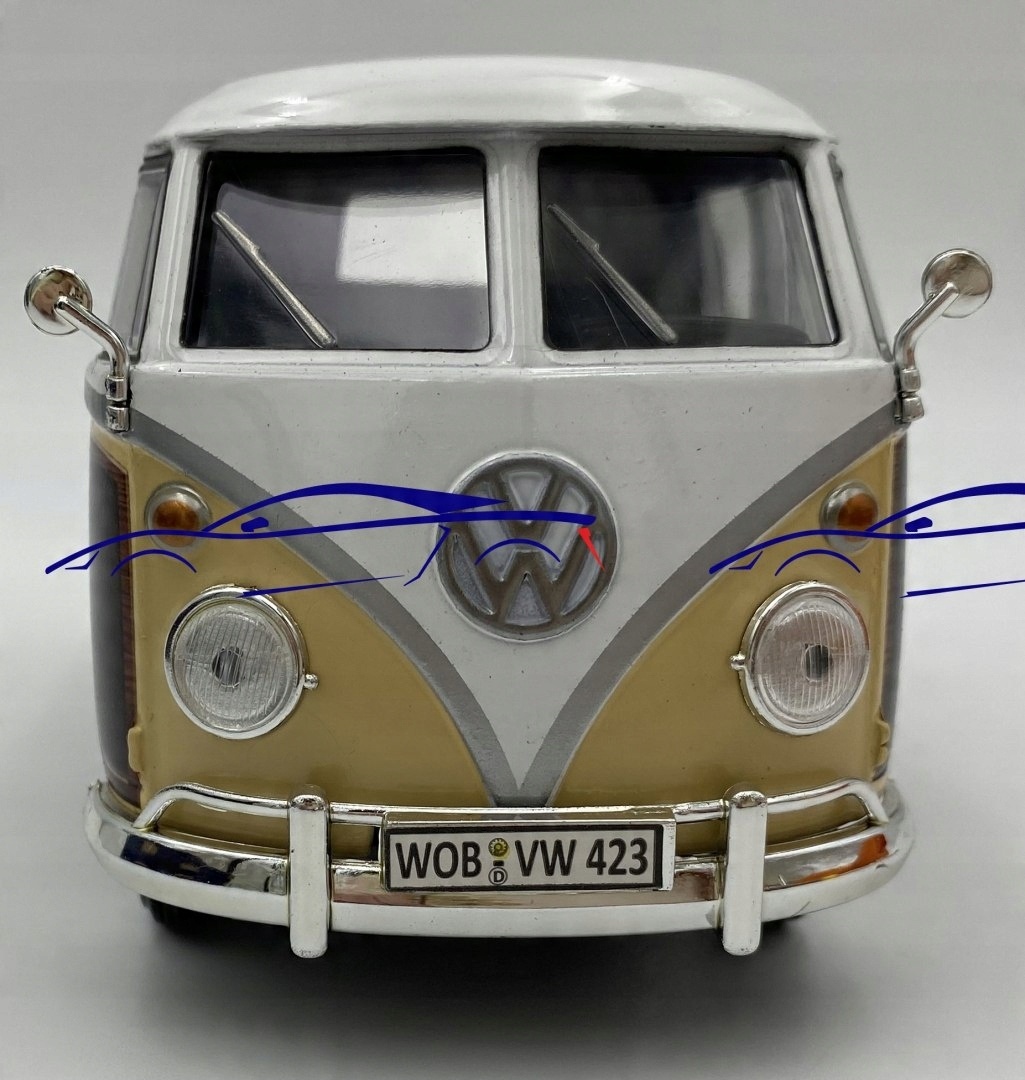 Volkswagen Type 2 (T1) з моделлю серфінгу (Motorormax моделі Ліцензований автомобіль VW ®. Він має рухомі елементи - двері, нахилені задні двері над двигуном, колесами, серфінговою дошкою