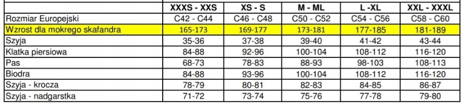 * ПРИМІТКА. Таблиця розмірів наведена лише для ілюстрації та не забезпечує 100% впевненості щодо вибору відповідного розміру. Лише фізична примірка гідрокостюма дає нам таку впевненість.