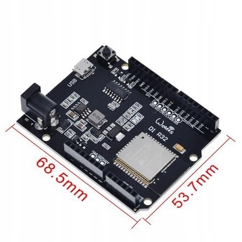модуль з мікроконтролером ESP32, сумісним із світлодіодами Arduino UNO R3, тактовуючи з годинником 240 МГц. Підтримує бездротове підключення Bluetooth та Wi -Fi. Він має вбудований контролер CH340 та мікро USB -порт, щоб він міг запрограмувати безпосередньо з комп'ютера за допомогою середовища Arduinoide. Модуль може працювати від 5 В до 12 В. Блок живлення може бути в діапазоні 5 ÷ 12 В. Technical: