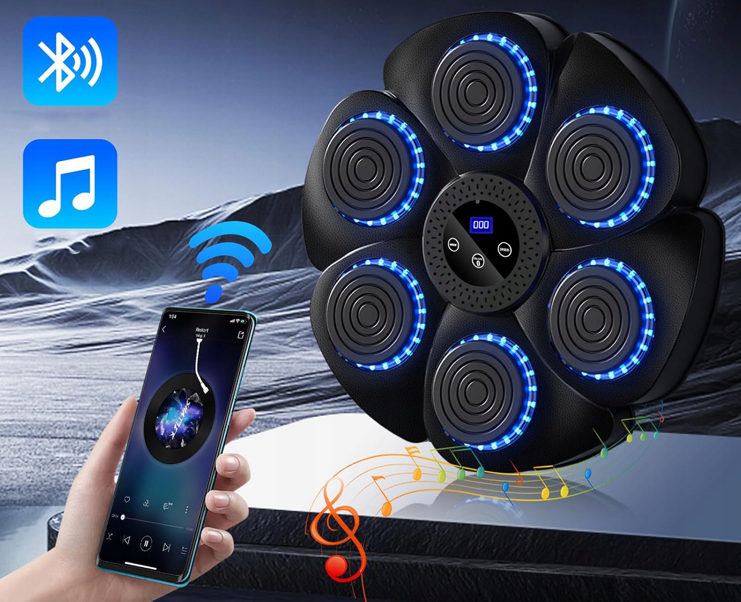 Реалістичний боксерський досвід: Наш боксерський апарат Bluetooth оснащений вбудованим динаміками та підтримує підключення Bluetooth, що дозволяє швидко підключитися до мобільного пристрою та плавне сполучення. Ви можете насолоджуватися боксом до ритму улюбленої музики. Потяг до ритму музики та з світлодіодним освітлювальним ефектом для поліпшення гнучкості, координації та швидкості реакції.